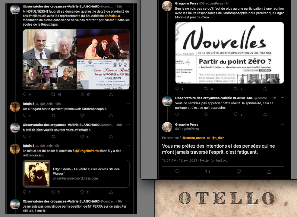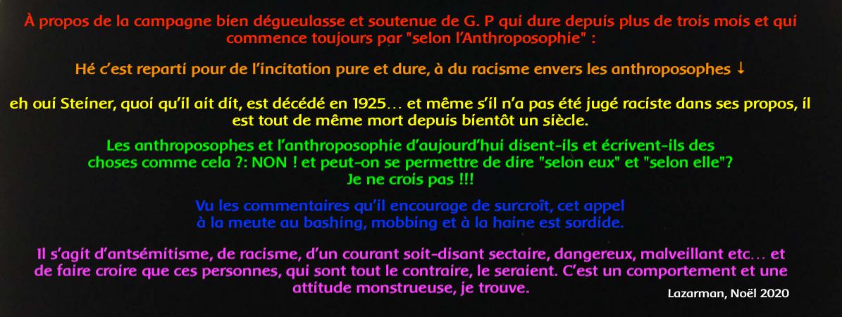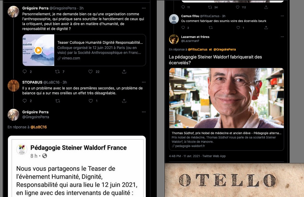 La folie des soupçons, l’effet Othello. Depuis des années GP déshonore tout à chacun en leur prêtant différentes proximités et implications avec les anthroposophes qu’il déteste tant… ça commence à se voir et ce faire sentir, de plus en plus…