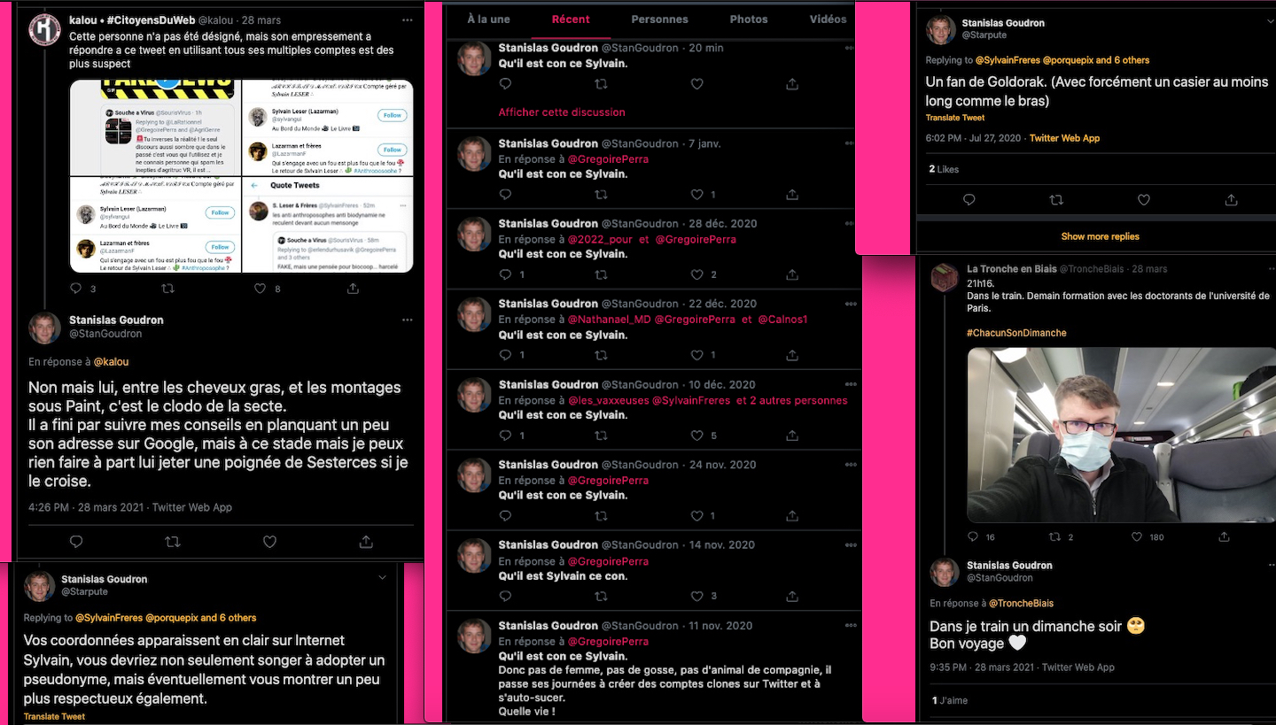 En effet, il y parle de l’arbre à caoutchouc, que l’on saigne pour en extraire le…!?!, Quelle était son intention, son message? C’est très tordu de faire ça, pourquoi le faire? Son but serait-il de me provoquer, de me menacer, de m’intimider, de me faire peur, de me déstabiliser, de nuire à ma compagne? Il s’en prend là à ma famille dès à présent et en discute justement sur Twitter avec une personne sous le pseudonyme StanGoudron qui m’a fait des menaces de m’envoyer des gros bras…(j’avais d’ailleurs déposé une plainte contre x, ce compte poubelle). J’ai donc fait un signalement à Twitter, pour une fois, et à Pharos comme il se doit. Il va falloir expliquer pourquoi d’un coup, d’un seul, il sort cette photographie de son chapeau, et pourquoi il la montre à son copain sur Twitter parmi tous ses ami e s trolls menaçants et insultants. C’est une affaire dont la police doit être mise au courant, j’en suis certain. Je vais aller dîner avec mon avocat cette semaine, si le couvre-feu m’y autorise... A suivre…