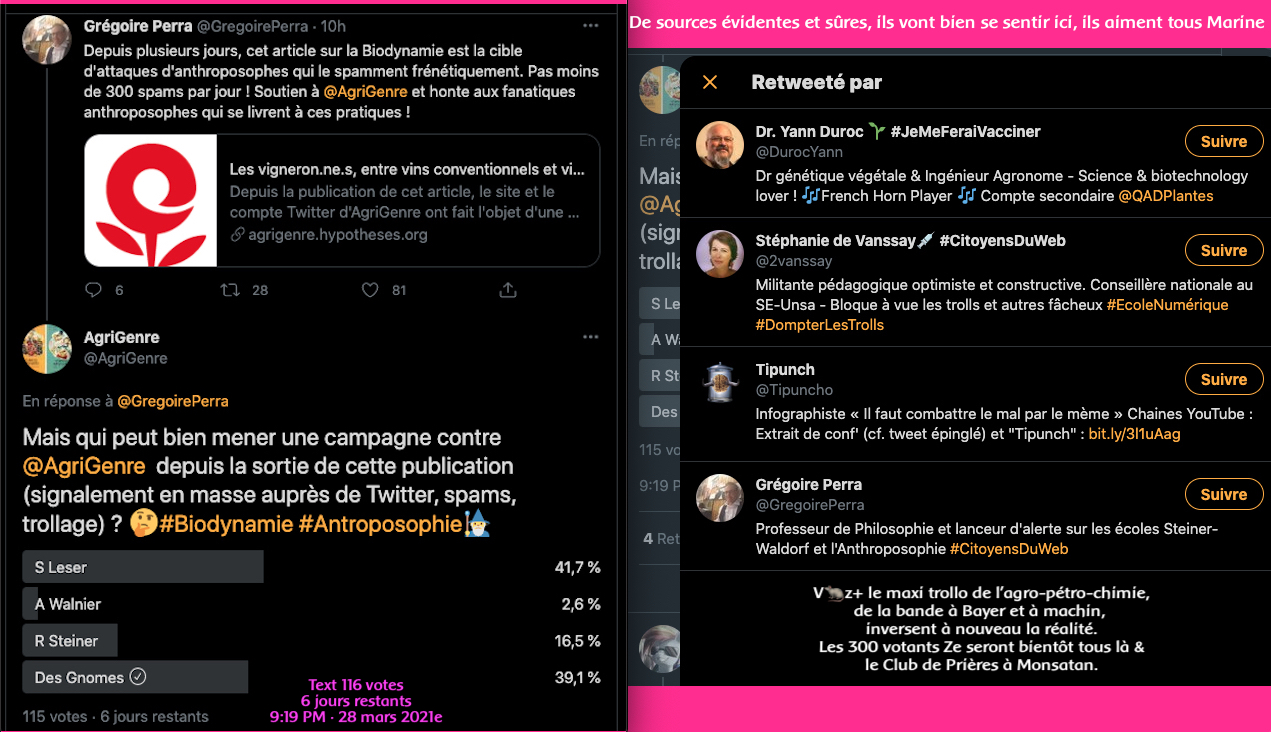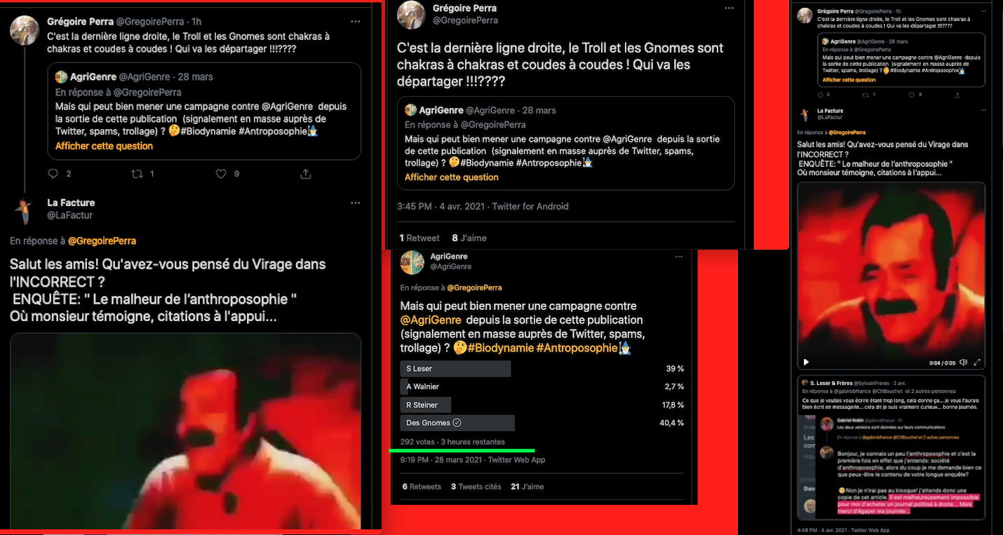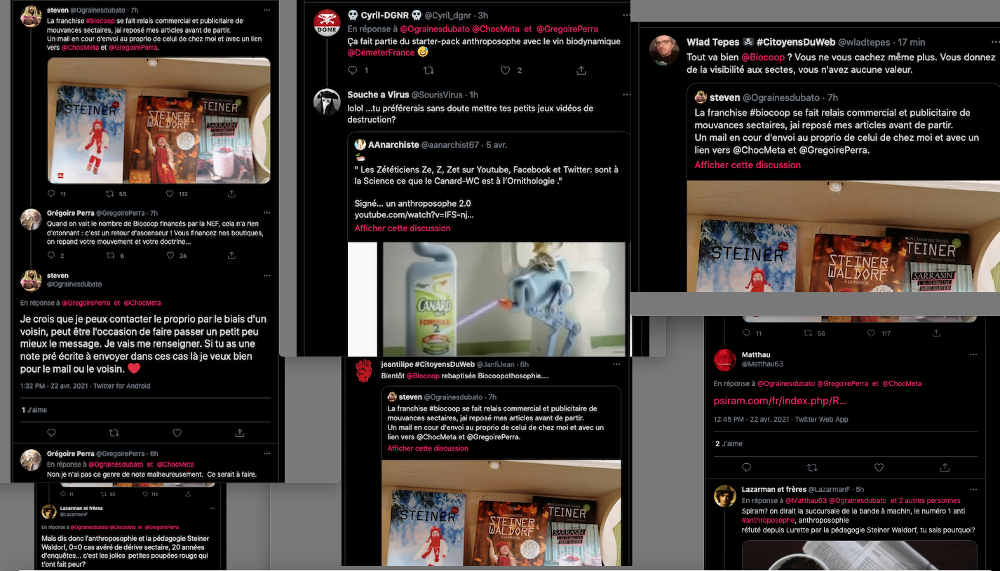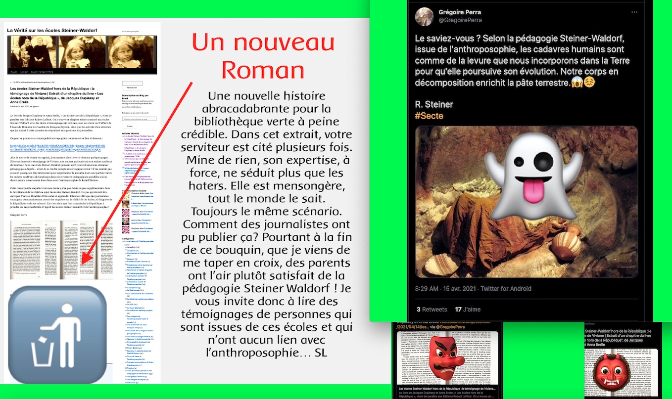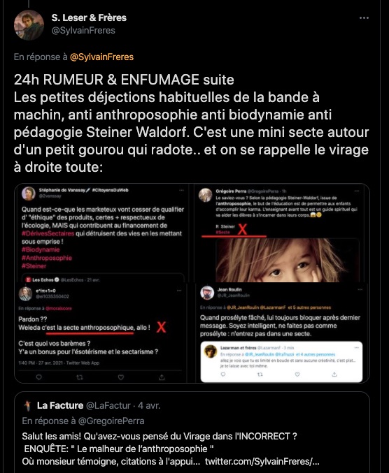 Tiens la bande à Perra qui s’en prend à Biocoop et à la pédagogie Steiner Waldorf comme d’hab. Mais le niveau Ze là est très faible, des trollos minables, juste de la diffamation habituelle sans trop d’importance ⬇︎ si ce n’est que c’est quotidien.