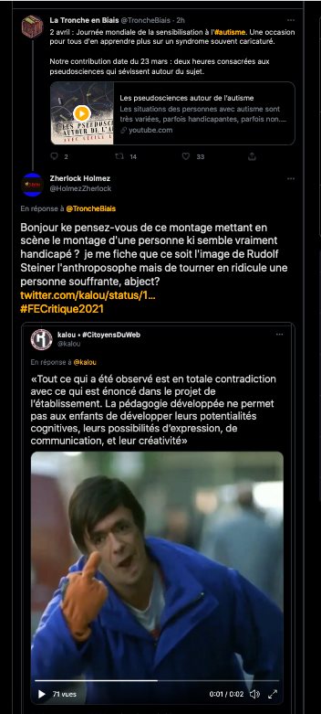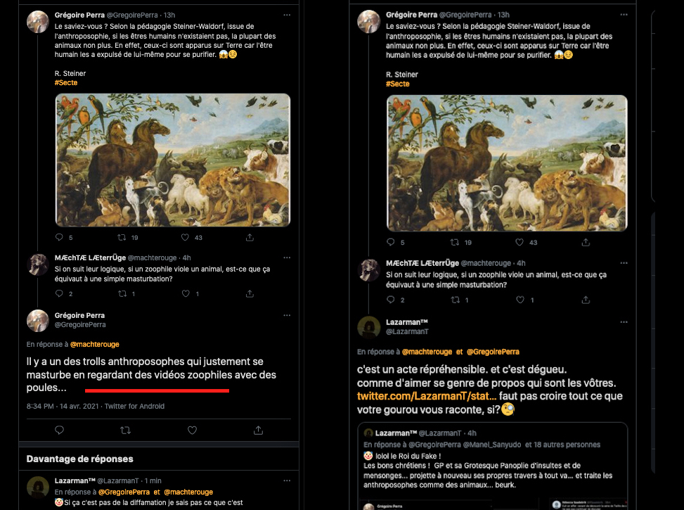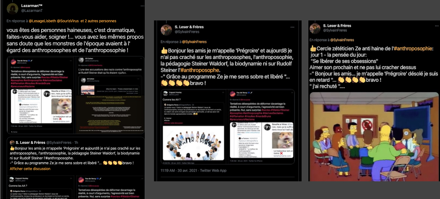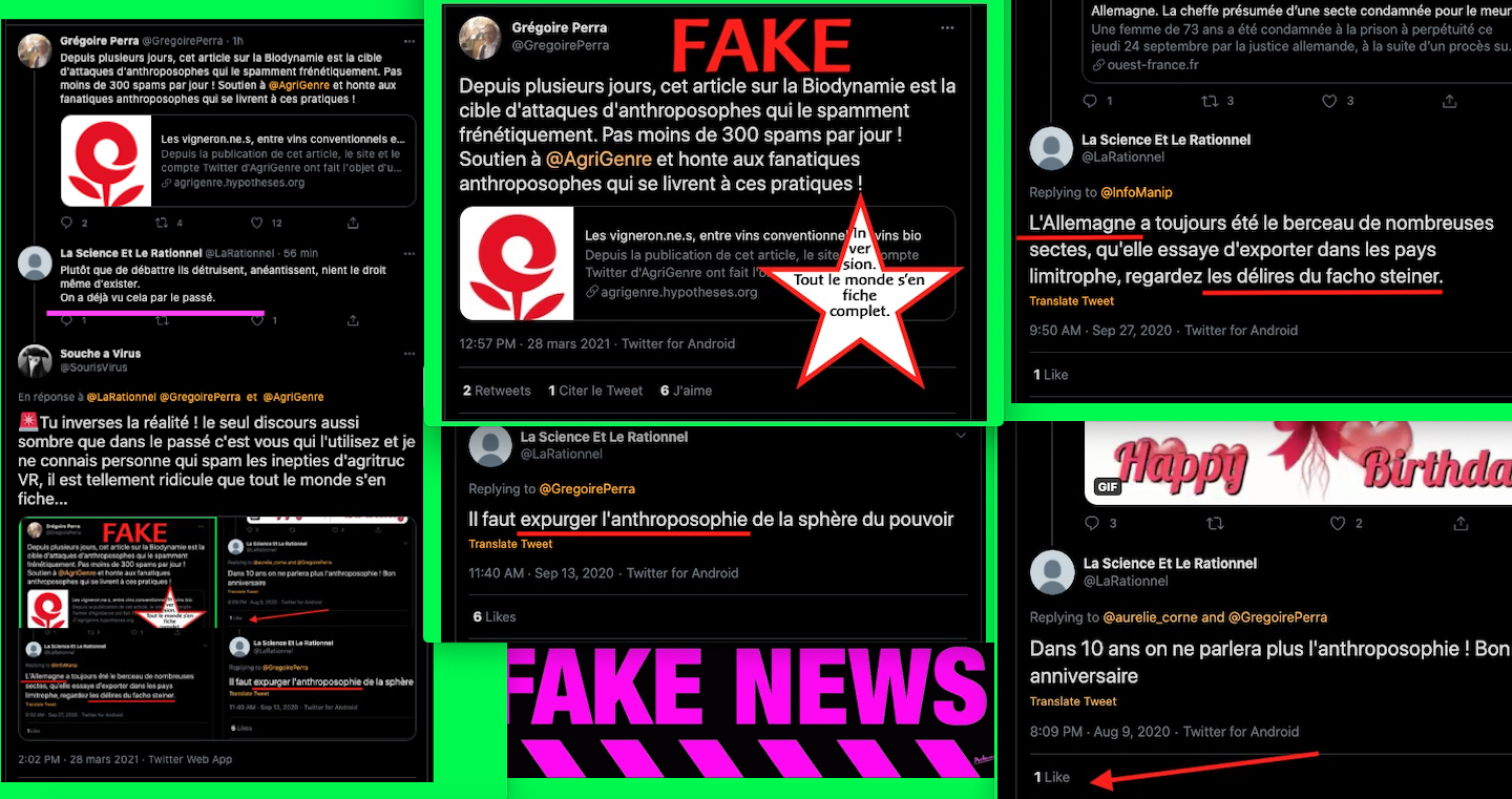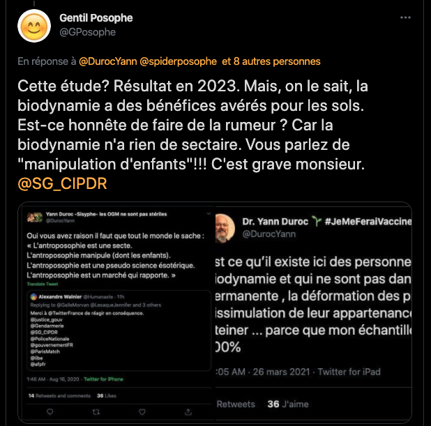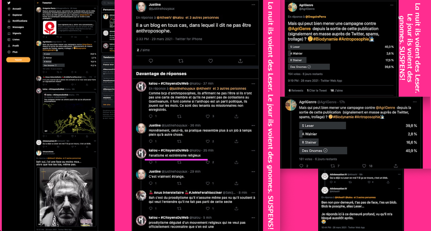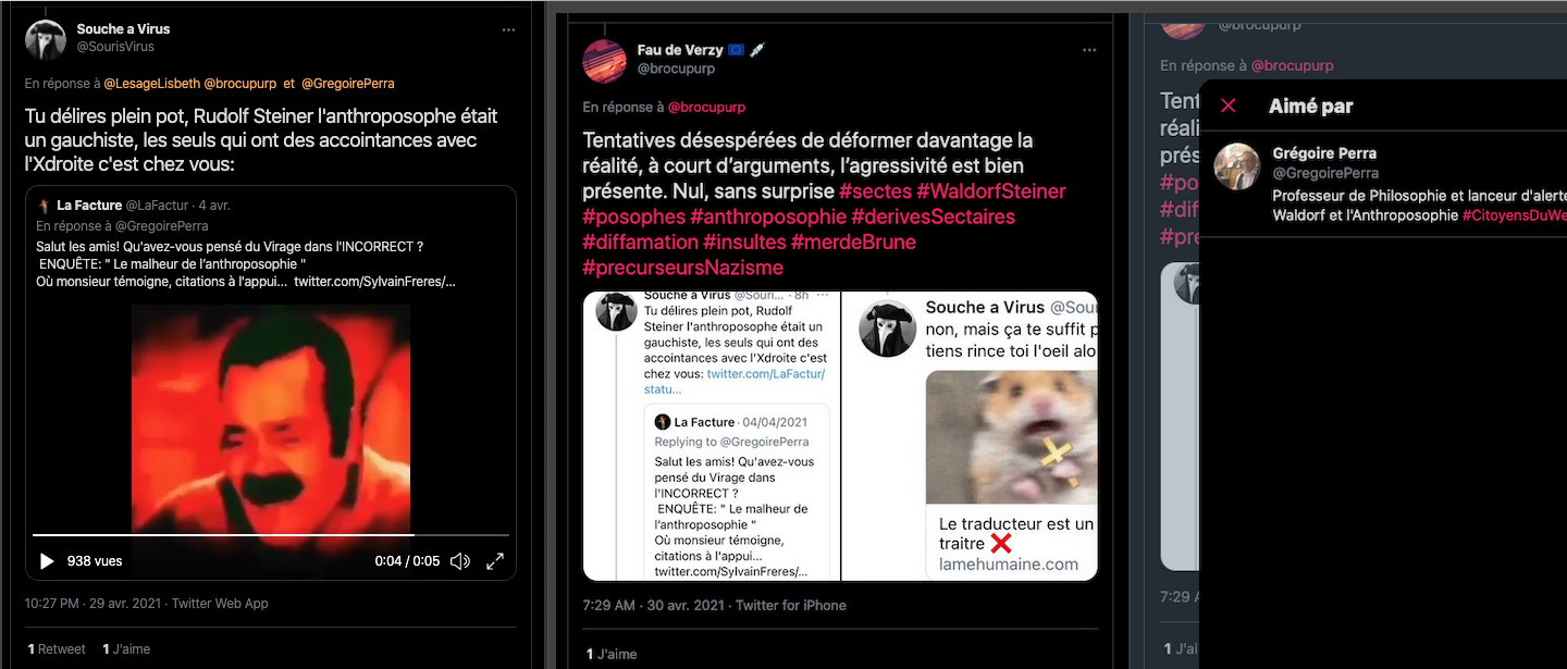 Tiens la bande à Perra qui s’en prend à Biocoop et à la pédagogie Steiner Waldorf comme d’hab. Mais le niveau Ze là est très faible, des trollos minables, juste de la diffamation habituelle sans trop d’importance ⬇︎ si ce n’est que c’est quotidien.