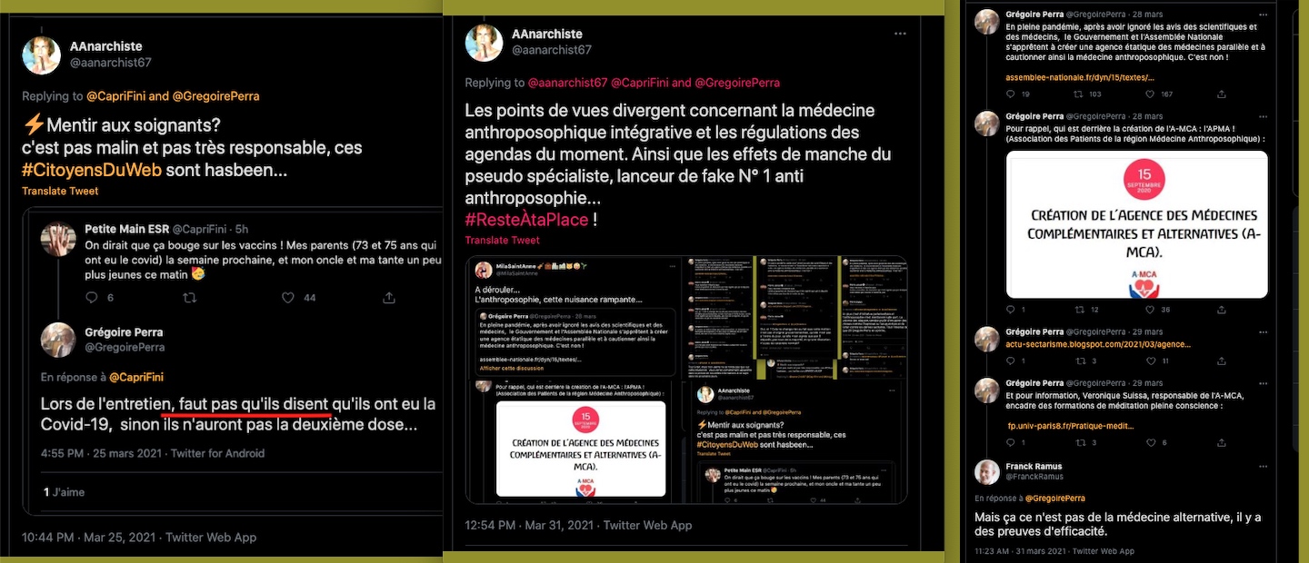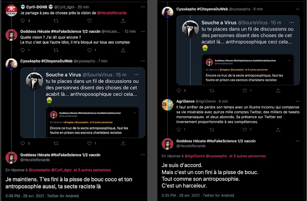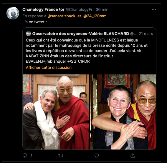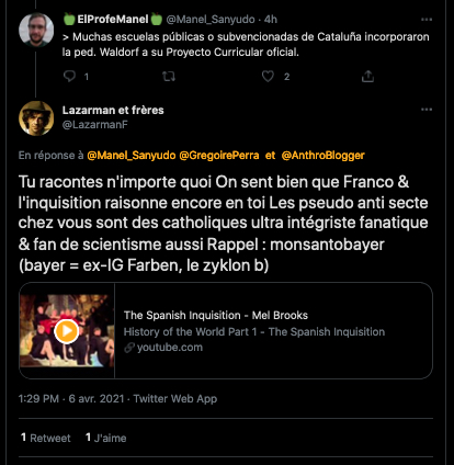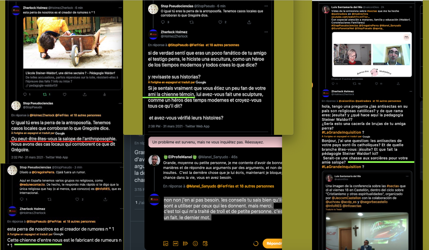 Les espagnols s’en mêlent, je les ai observés. J’y ai passé une journée complète et plus. Sur quelques jours, je constate que c’est pareil que pour l’Hexagone : des cinglés avec un gourou à leur tête, intégristes-fanatiques-catholiques, avec une meute pour troller. Les pseudo anti-sectes sont, chez eux, une grosse secte scientiste et religieuse, point C’est l’inquisition 2021.