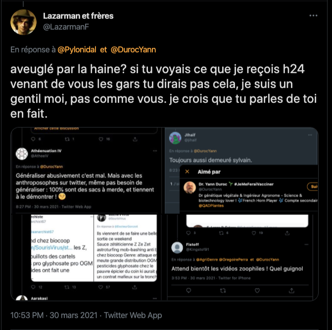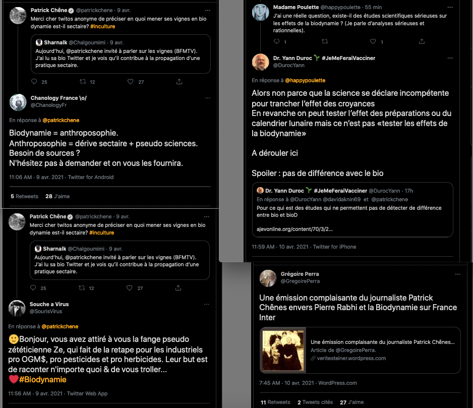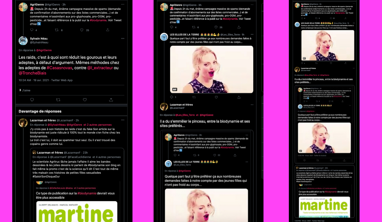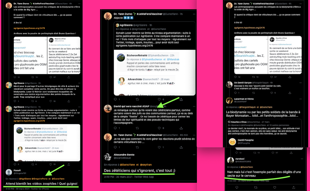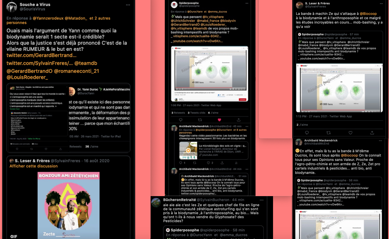 Dimanche et lundi 25/6 avril Ils attaquent les enseignes, boycott, mob-bashing en meute organisée, astroturfing. ils attaquent idéologiquement les politiques soutenant le bio/biodynamie, etc. Vomis, rumeurs, mensonges, trollings, diffamations, allégations multiples et diverses ,calomnies, c’est quasiment un business et c’est délictuel. Et tout y passe…