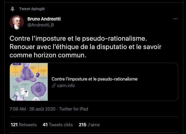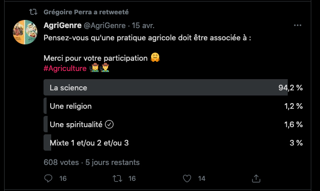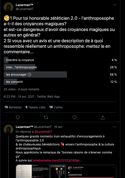 Je vais pas trop vous recauser de: V🐀z+ le maxi trollo de l’agro-pétro-chimie qui bosse souvent avec l’Afis et qui est à la cour de GBronner. Vrasplus est aussi connu pour envoyer des messages à tout le monde et de tweeter et d’effacer ses propres tweets. Un crétin plein d’un humour bête. Il a sans doute un mauvais fond, « question Tweet effacé » y à qu’a voir: http://wiki.reopen911.info/index.php/Val%C3%A9ry_Rasplus , https://twitter.com/nikitakarachoi/status/1095344411691474952?s=20 Le gars qui chouine et rechouine en dm, et j’en cause là aussi en bas de page : https://lamehumaine.com/2020/10/06/biodynamie-hips/ & https://lamehumaine.com/2020/09/27/le-retour-du-gourou-prophete/ ⬅︎ et surement quelques relents de sa connerie ici ➳ : https://lamehumaine.com/2020/09/27/ca-pue-du-bec/ mais sans grand intérêt. Toutefois, on va bien voir le nombre de votants, car 25 minutes après son coup d’envoi, il y en avait déjà 61… ça en dit long sur qui troll qui... 98 votes 6 jours restants, posté il y a une heure…