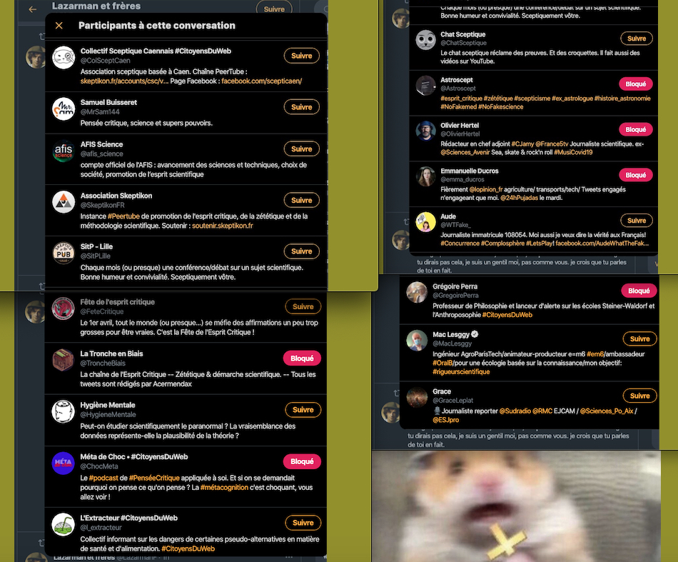 Qui donc se cachent derrière ces pseudo CitoyensDuWeb? Eux qui se plaignent sans arrêt de ce qu’ils font aux gens, comme un véritable job, …et en inversant la réalité? C’est chaque fois le même pipeau… J’en parle un peu dans l’empilage précédent : https://lamehumaine.com/2020/09/27/les-empilages-recents-❌/ . Des voyous 2.0 qui menacent de t’envoyer des gros bras, le font-ils? Ou bien ces geeks sont uniquement des petits gars qui se croient sur Netflix? Victor les observe depuis des années, allez sur sa chaine: https://www.youtube.com/watch?v=WdwtVrWfWSU , c’est comme ça que j’ai commencé à comprendre ce qui se passait avec ces ingénieurs sociaux et la zététique 2.0. À la base, cet univers ne m’intéressait pas mais il se passe réellement quelque chose de grave avec cette fange du web. Avec certes un avantage numérique : ce sont des bosseurs et il doit y avoir quelques biftons bien cachés. Pour les comptes poubelles et les gamins qu’ils ont endoctriné, un effet de secte. Vous pouvez y aller: tout ce qu’ils disent sur les autres, vous pouvez leur attribuer. Cela fonctionne et vous vous rapprocherez ainsi de la vérité concernant ces grouillots des cartels industriels criminels de l’agro-pétro-chimie, la bande à Bayer Monsatan.