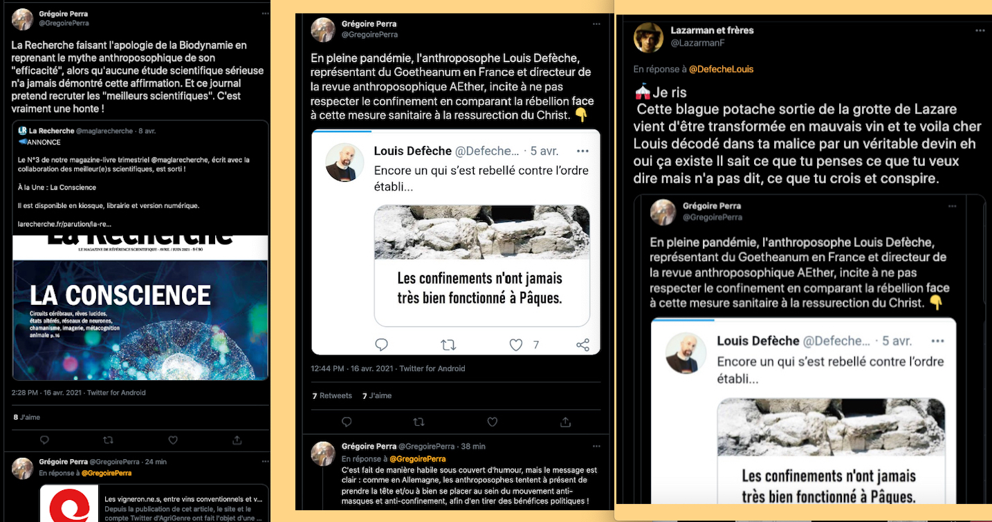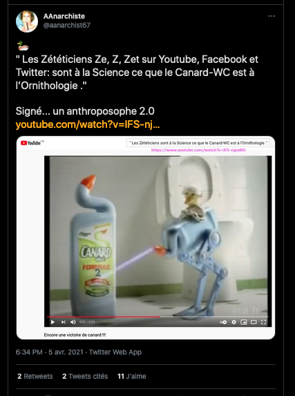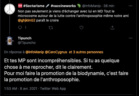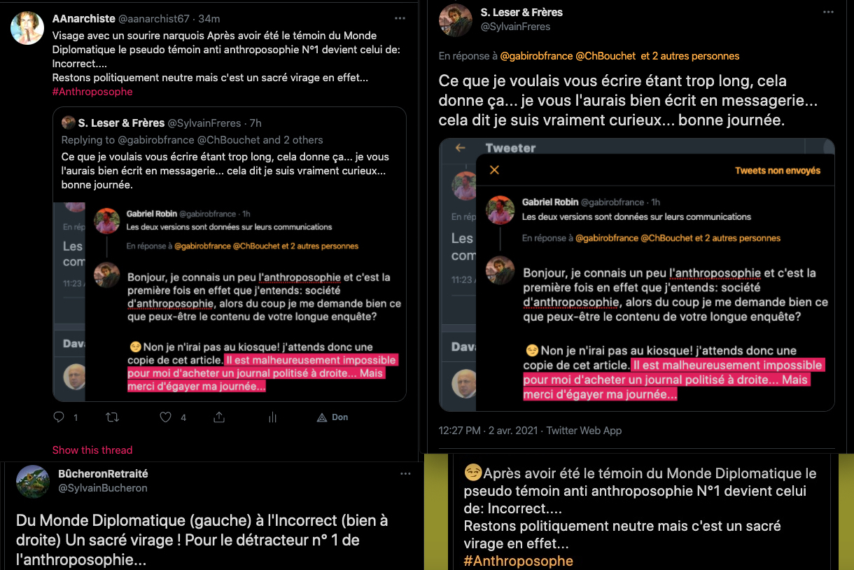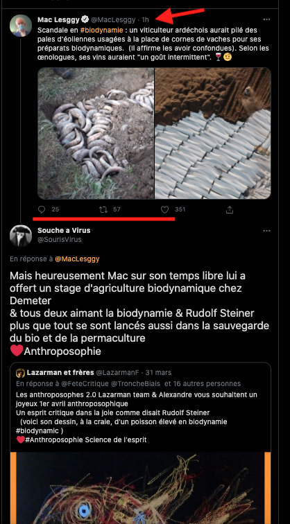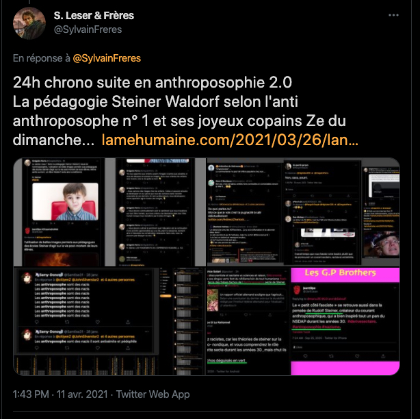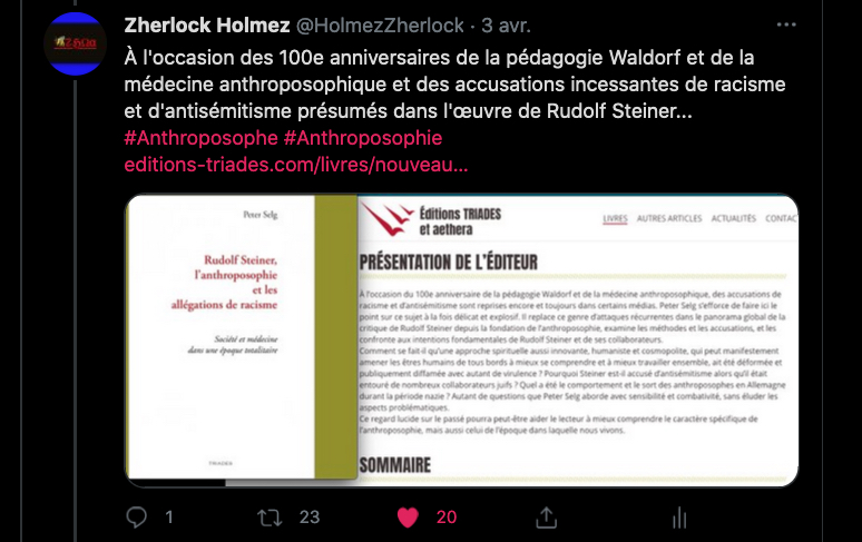 12 avril 1/2 La suite des aventures de l’anthroposophie 2.0 et du détracteur n°1 de « l’anthroposophe » , de la biodynamie etc. La bande Ze à machin. Les discordes. Les conflits d’intérêts et l’autre qui invente des histoires à faire peur aux enfants concernant la pédagogie Steiner Waldorf… Les conflits d’intérêts des Ze dans les médias… Reichard VonMoisi lit ses nouveaux mensonges, c’est tout une plâtrée lui…
