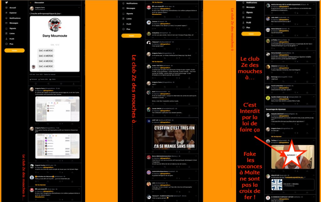 Cet empilage change de cap car on vient de me prévenir, qu’à nouveau, je me faisais insulter. Je n’avais pas encore vu ces insultes du 20 mars 2021 de Talos, suite à la diffusion de listes me concernant, qu’ils font tourner dans tous les sens : ça fuse de partout depuis quelques temps et qui, en plus, ne sont pas exactes…, je serais le propriétaire du compte Twitter « Grégoire Perra officiel » par exemple et d’autres encore ! Le tout prête à une confusion volontaire incitant à la haine de ma pomme, alors on recommence ⇣ Ils peuvent signaler et faire suspendre mes comptes, je m’en fous et m’en tape car ils ne font que ça alors, je le redis: cela facilite mon travail d’archivage, c’est suspendu au public ? No problemo : l’interface est dispo…. Ils peuvent y aller, j’suis dans le clous moa. Le système étant, tu me fermes la porte (ma liberté d’expression) ? Bah je reviens par la fenêtre… ! Tu lances tes meutes ? Hé hop… auto défense intellectuelle ! C’est crescendo depuis le début. Je comprends bien que les pervers narcissiques ne capitulent pas facilement et qu’ils veulent le dernier mot mais je ne me laisserais pas abuser. Ai-je sérieusement une tronche à me laisser abuser? Ça devient irrationnel de croire cela, garçon.