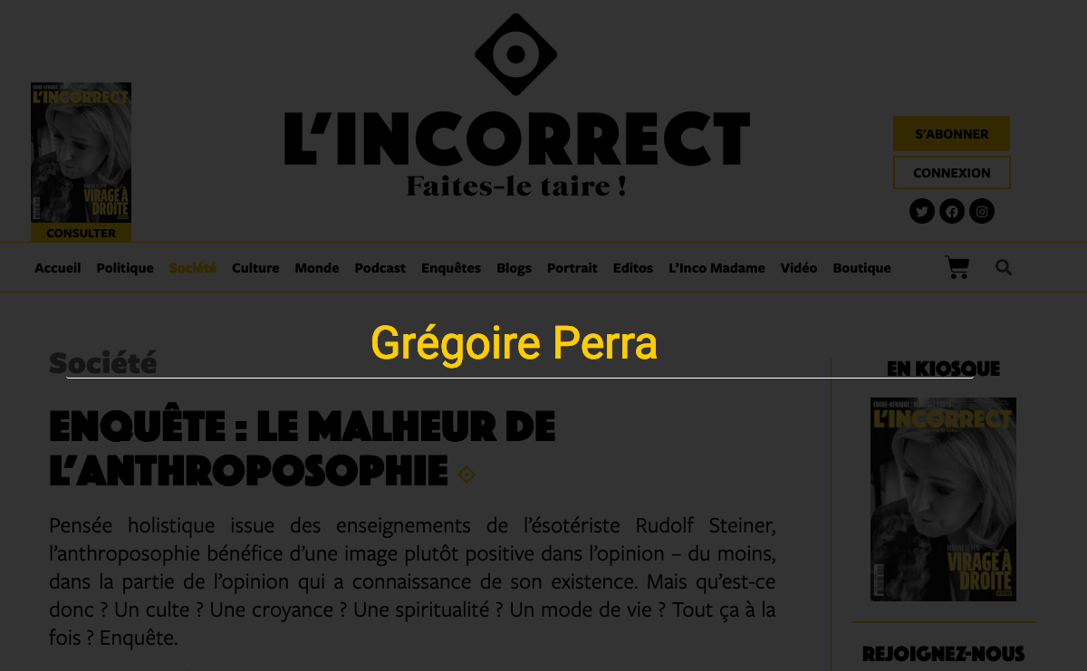 Grégoire Perra diffuse à présent ses mensonges chez l’INCORRECT: un magazine entre extrême-droite et bien à droite droite. Sacré virage depuis le Monde Diplomatique, de genre gauche. Même genre de dossier farfelu, avec des témoins qui voudraient rester anonymes mais qui n’existent pas et qui ne témoignent pas d’ailleurs… Il n’y en a que pour lui, comme d’hab’… pourquoi ce revirement? Va-t-il voter Marine? Suspens !!! – au-cas-où les bottes reviendraient?