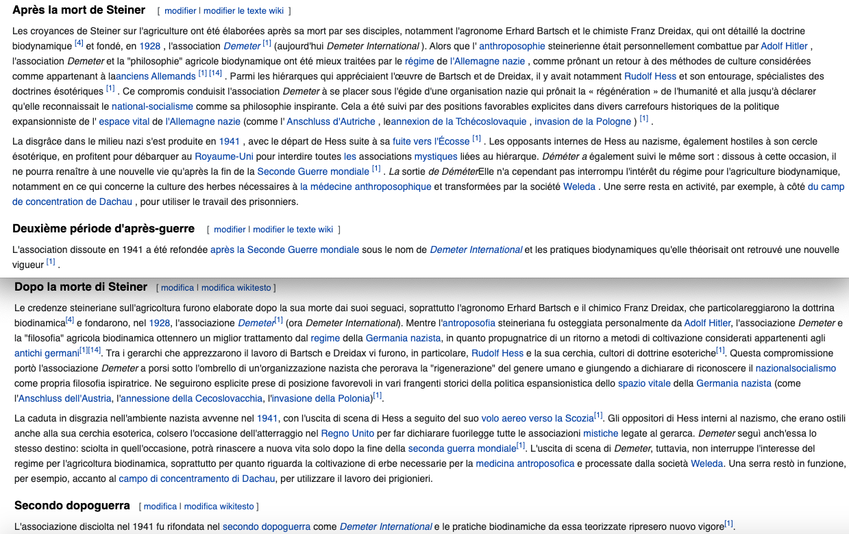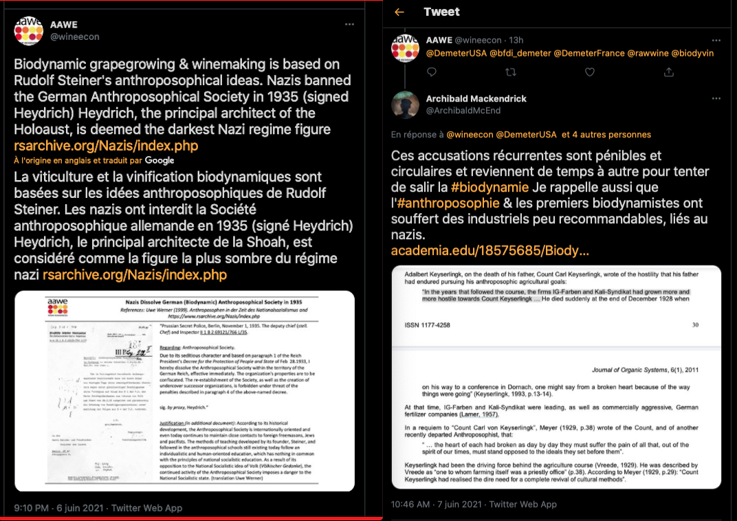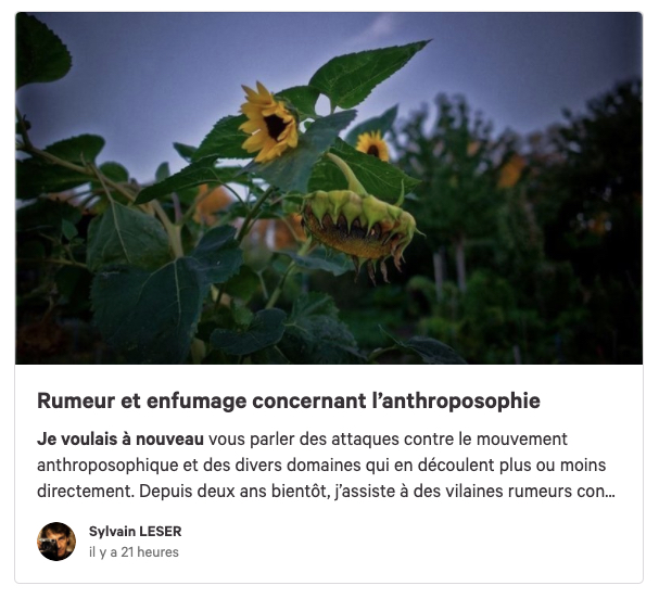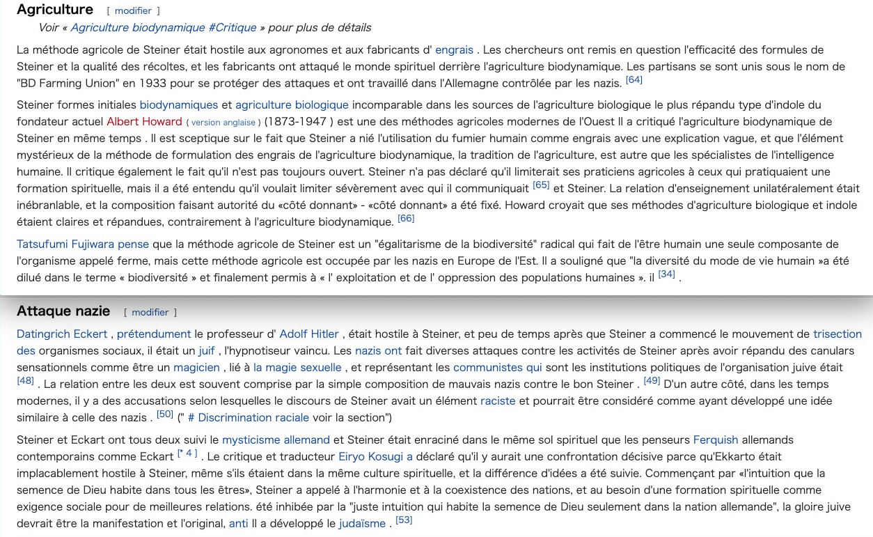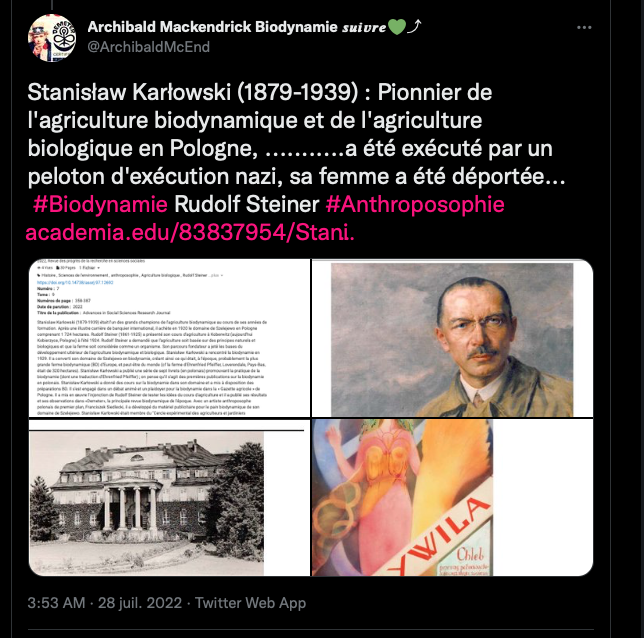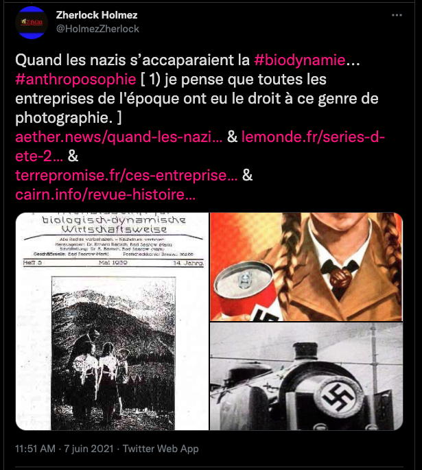 https://twitter.com/SylvainFreres/status/1546430937000468481?s=20&t=t-eY_tmJ_hURhudvN0Qsjw & Anthroposophie/biodynamie et allégations de racisme. Non exhaustif. https://aether.news/transparence-anthroposophie/⊠https://aether.news/anthroposophie-par-les-faits/⊠https://aether.news/quand-les-nazis-s-accaparaient-la-biodynamie/⊠https://aether.news/l-anthroposophie-en-debat/⊠https://aether.news/contre-l-antisemitisme-et-le-nationalisme/⊠https://aether.news/rudolf-steiner-contre-le-racisme/⊠https://twitter.com/SylvainFreres/status/1465274968397201408?s=20&t=FDrlOgWiH_gy-xMtqGSOmw