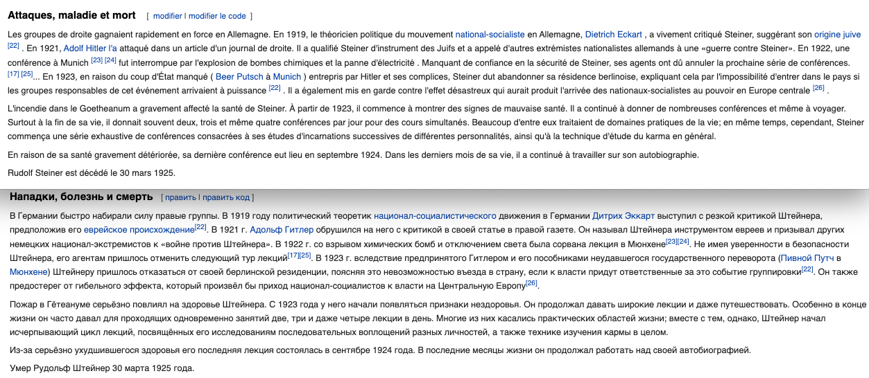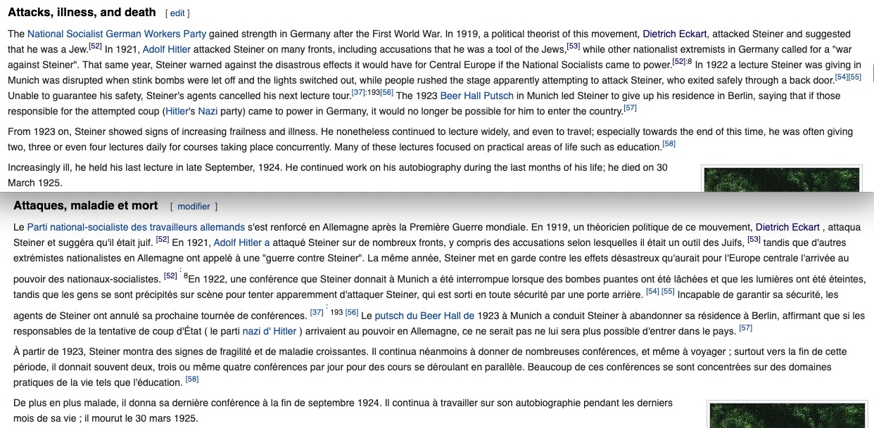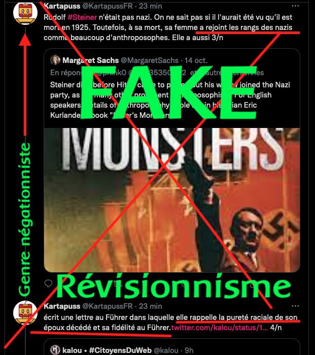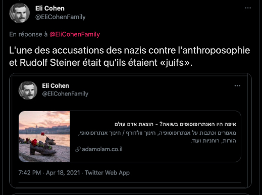 https://twitter.com/LaFactur/status/1407673579404136449?s=20 & https://twitter.com/LaFactur/status/1407676845496152064?s=20 Rudolf Steiner Ă luttĂ© contre l’antisĂ©mitisme , dire le contraire c’est faire du rĂ©visionnisme, ce qui est proche du nĂ©gationnisme.