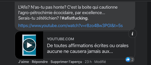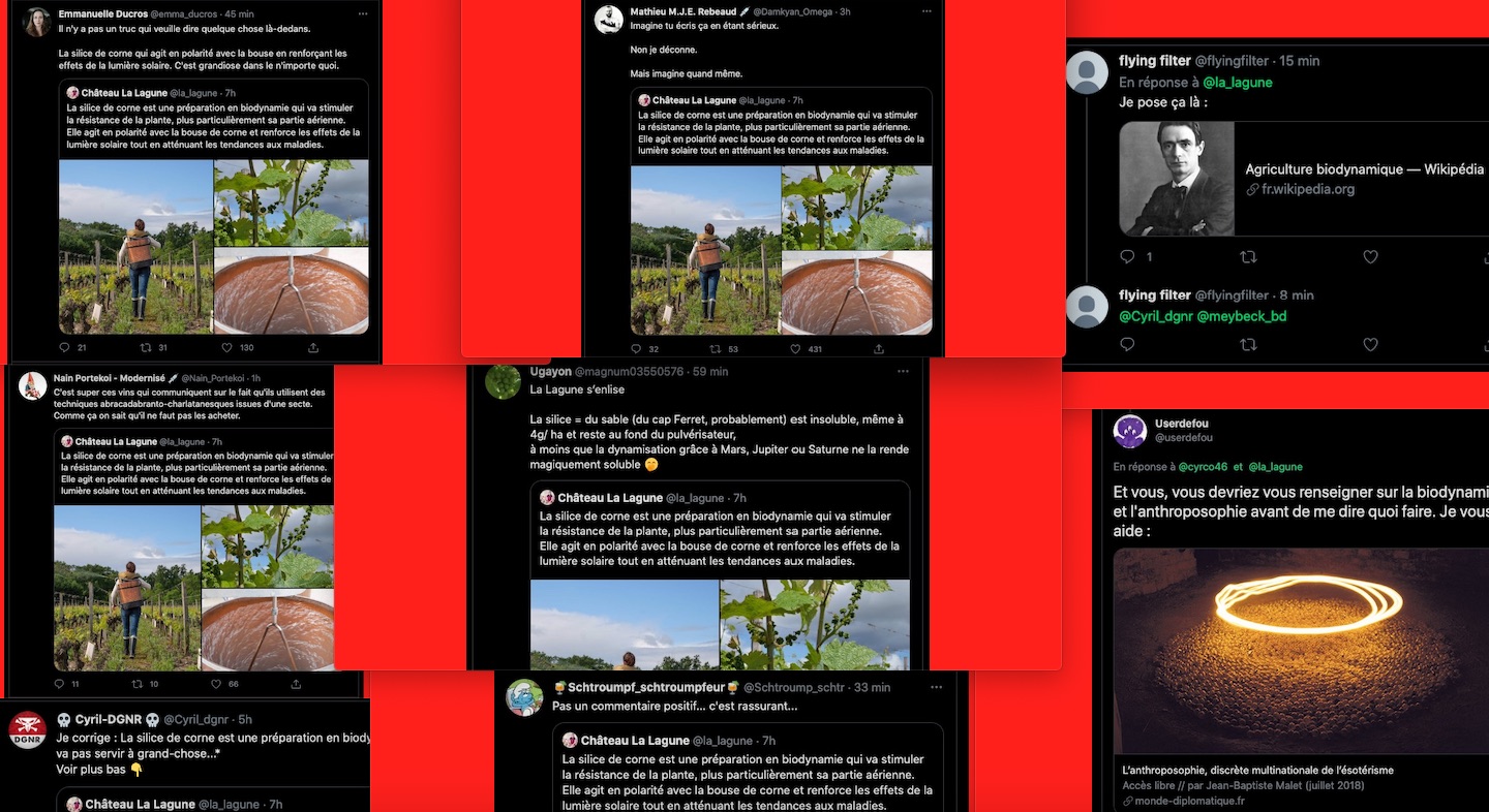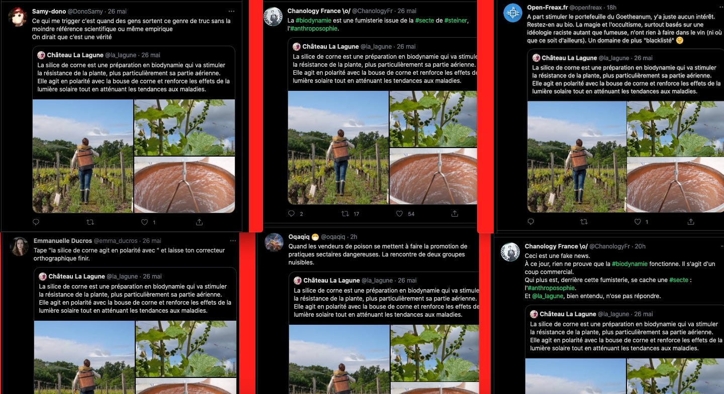 Grosse attaque du clan, de la meute, de la milice zĂ©tĂ©ticienne sur une publication d’un biodynamiste de renom connue par toute la critique pour ses vins excellents. Les arguments fallacieux sont toujours les mĂȘmes: ce serait pas scientifique, c’est donc magique, c’est une secte. Vous rĂ©futez naturellement et ça devient alors une histoire nazi et pĂ©do-criminel… Perso je trouve que du vin magique c’est un bel argument de vente, une sorciĂšre au fond de la bouteille, c’est chic et plein de poĂ©sie. Pour le reste je pense sincĂšrement qu’il faut traĂźner les personnes responsables, de ces horribles rumeurs circulaires aux tribunaux. Je vais pas vous mettre tous les liens (c’est des milliers), toutes les rĂ©ponses, car la Ă nouveau, il y en a beaucoup trop.