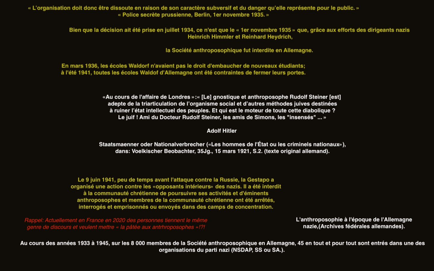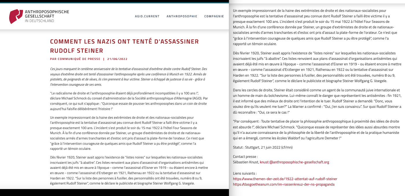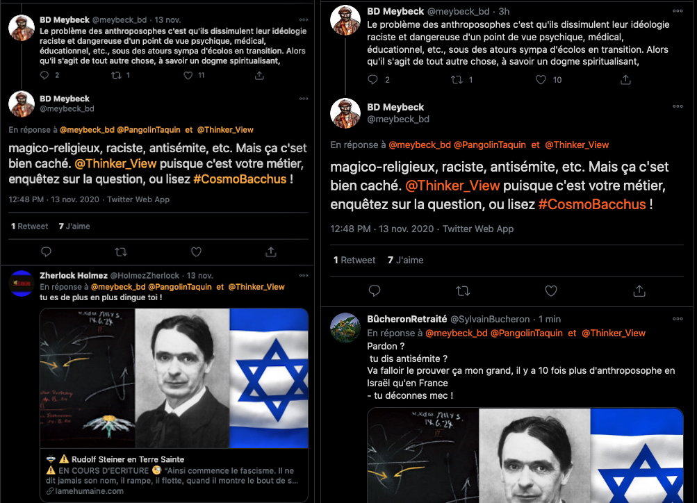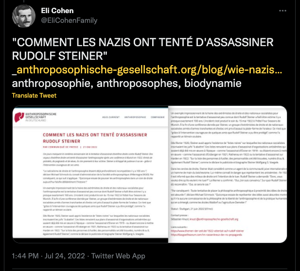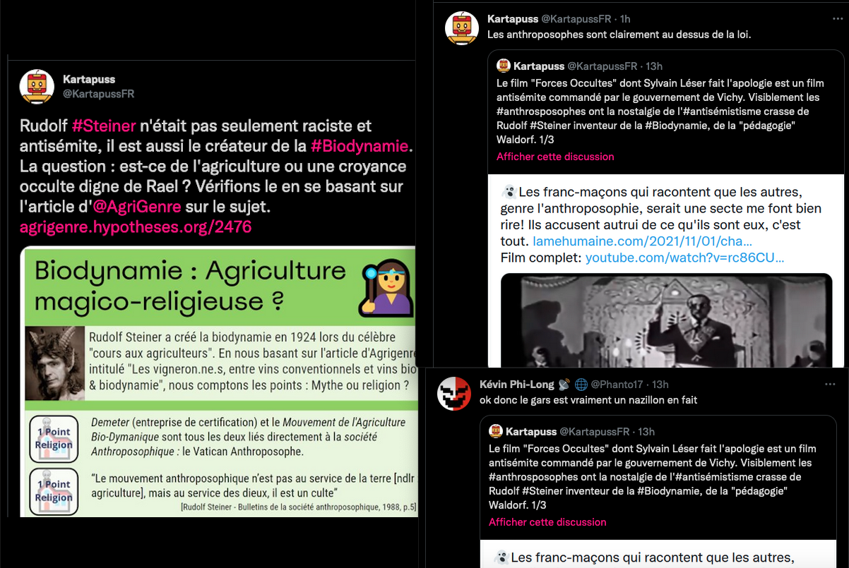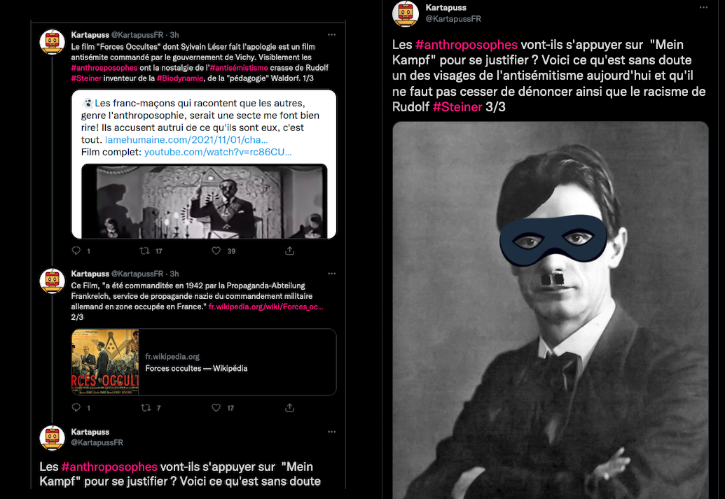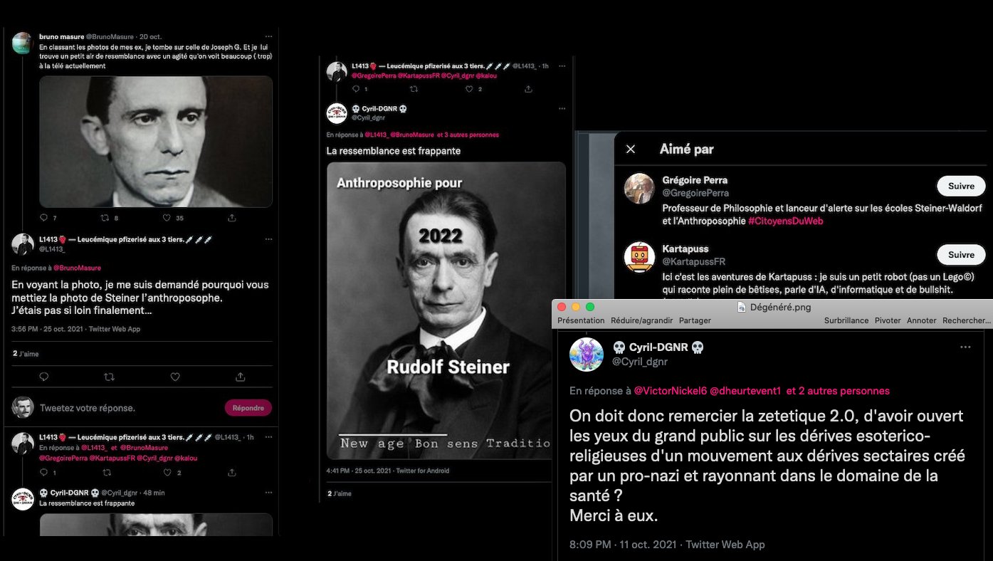 https://twitter.com/SylvainFreres/status/1556327928677498883?s=20&t=_5j9ksD0KODOrBoxzFGWTg & https://twitter.com/FantomeRudolf/status/1450152081168420866?s=20&t=Ylug0z9ya7z7fzZOJ-OVuw & AllĂ©gations de racisme dâantisĂ©mitisme et de nazisme Ă lâencontre de Rudolf Steiner, lire: