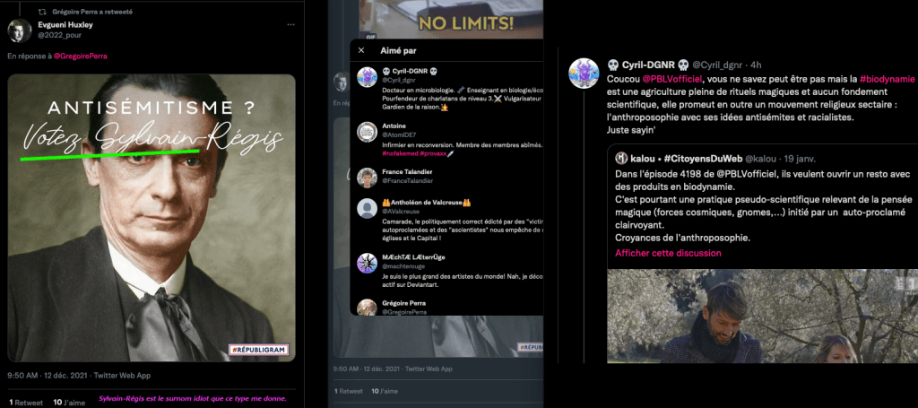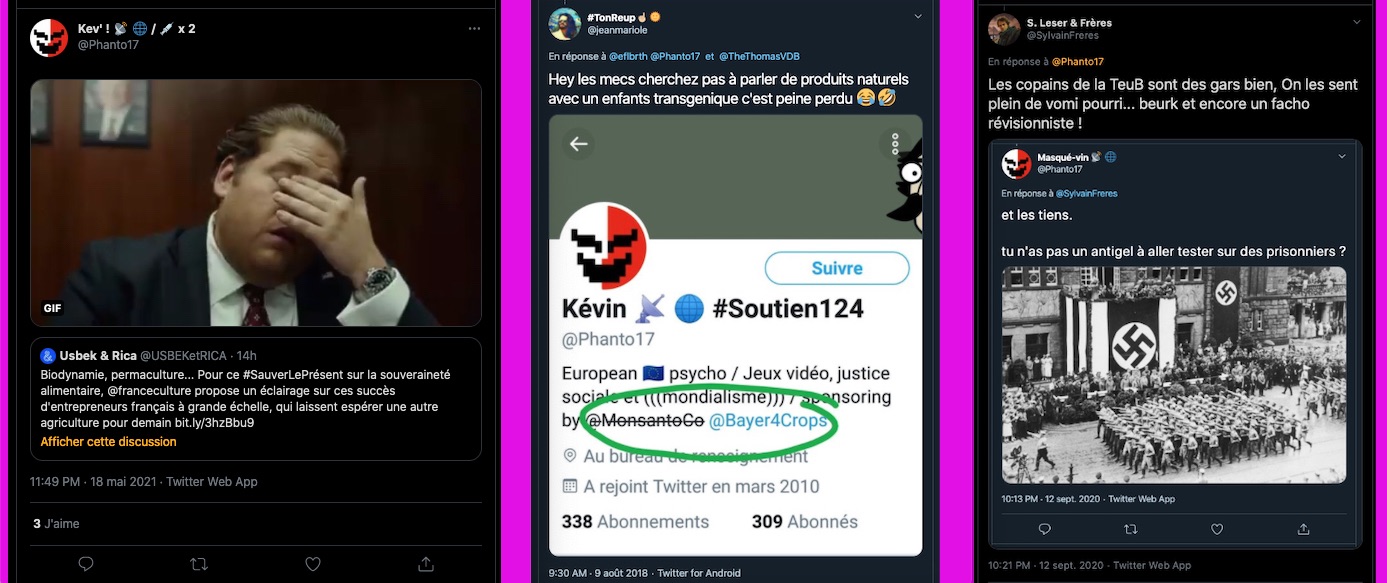 150 Xx commentaires insultants 77 Xx retweets insultants – Cas d’Ă©cole: https://twitter.com/SylvainFreres/status/1397606787029864449?s=20 & https://twitter.com/SylvainFreres/status/1397606787029864449/retweets/with_comments & Vous ĂȘtes ‘victime’ d’une meute d’astroturfeurs, issus de la pseudo zĂ©tĂ©tique anti #biodynamie et anti #bio car pro peticides, herbicides et engrais azotĂ©s synthĂ©tiques et ogm mal trafiquĂ©, l’agrochimie, bon courage… : https://twitter.com/SylvainFreres/status/1397611007476916226?s=20