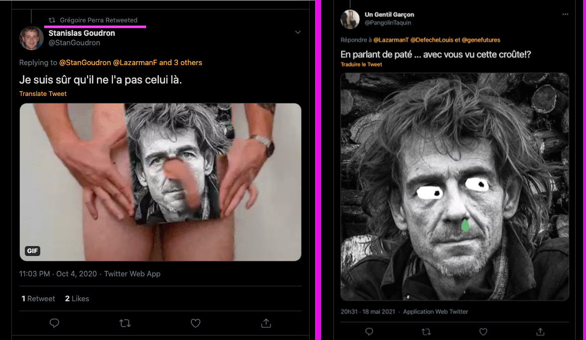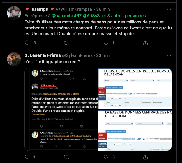 https://twitter.com/HolmezZherlock/status/1455184634027851786?s=20 & https://twitter.com/HolmezZherlock/status/1455183085830643716?s=20 & Variante : https://twitter.com/lazarmanus/status/1455200299363221508?s=20 & https://twitter.com/HolmezZherlock/status/1455235073024958468?s=20 Fin : Non non mon grand, On ne plaisante pas avec cette pĂ©riode de lâHistoire en insistant lourdement en plus. Seul des personnes trĂšs malveillantes ou trĂšs bĂȘtes font cela. Le respect des victimes et de leurs descendants est important. https://twitter.com/HolmezZherlock/status/1455274240249372683?s=20 Encore : https://twitter.com/LazarmanF/status/1455288295076868104?s=20 & https://twitter.com/LazarmanF/status/1455285472985600007?s=20 & https://twitter.com/LazarmanF/status/1455281060955230208?s=20 & FAKE MON GRAND !!! tu en es? https://twitter.com/LazarmanF/status/1455464423460675585?s=20 & https://twitter.com/LazarmanF/status/1455288295076868104?s=20 & https://twitter.com/LazarmanF/status/1455481493548146694?s=20 & Les petits rĂ©visionnistes en marche , lâinfĂąme zsecte Ă©tĂ©tique, fabrication droite++ !!! https://twitter.com/lazarmanus/status/1455468785079566348?s=20 â Ah ouais? Sâen prendre Ă une bande de petits vieux inoffensifs câest noble? ZâĂštes sacrements ballochĂ©s les Zet ! https://twitter.com/MandrakeCagoule/status/1455672355943026693?s=20 & https://twitter.com/MandrakeCagoule/status/1455672510595403784?s=20