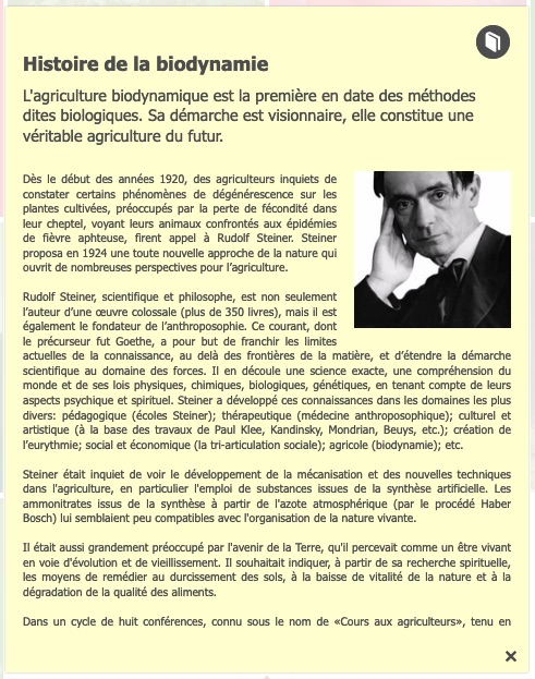 JâĂ©tais un peu lĂ©ger avec mon papier sur la biodynamie au niveau de la question historique mais câest en cours de rĂ©paration. Jâaxais mes idĂ©es sur le buzz que je dĂ©couvrais en mĂȘme temps que la plupart dâentre nous concernant les fans et pratiquants dâagriculture biodynamique, les champions du monde de « quelque chose », cinĂ©ma, spectacle, artistes, musiciens, princes et princesses lumineuses au public conquis, sports auto, tennis, foot, rugby ⊠ou que tu participes Ă âlâart thĂ©rapieâ Ă la campagne avec la vie dans les fermes avec des enfants et adultes qui ont des besoins spĂ©ciaux (handicapĂ©s) du mouvement Camphill. IrrĂ©prochable. https://lamehumaine.com/2020/10/06/biodynamie-hips/