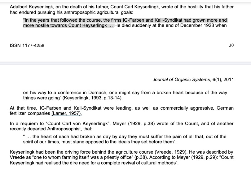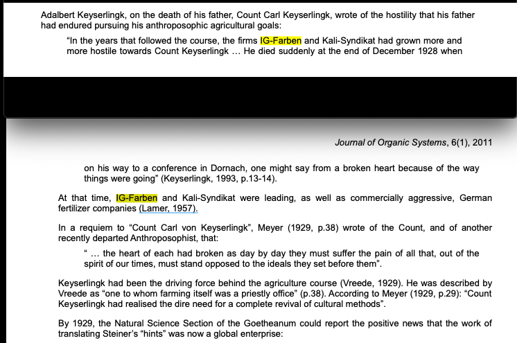 Les premiers grands dĂ©tracteurs agressifs et hostiles envers la biodynamie Ă©taient les entreprises IG-Farben et Kali-Syndikat devenues MonsatanBayer (bayer = ex-IG Farben, le zyklon b).. RĂ©cemment, les pro des ogm mal trafiquĂ©s, pesticides, herbicides et consortsâŠ