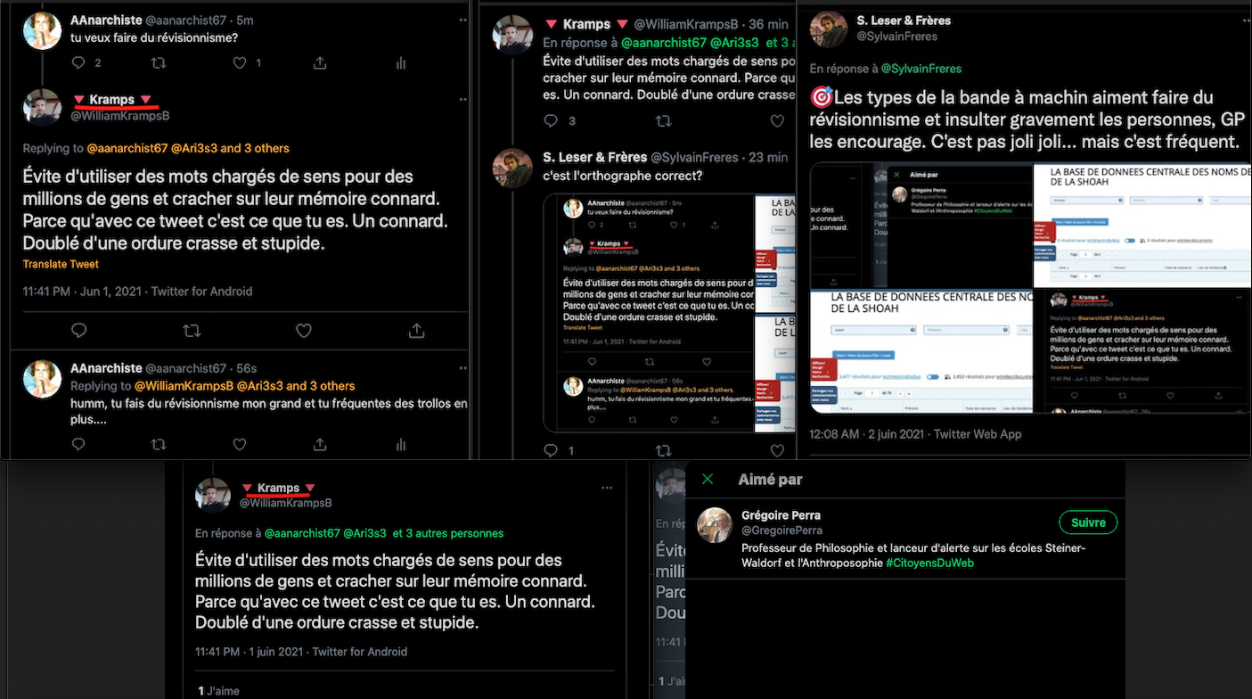D’abord ils t’insultent, ensuite il font du rĂ©visionnisme, puis ils t’insultent gravement. Le tout frisant la folie. …Et: GrĂ©goire Perra les encourage en ce sens.