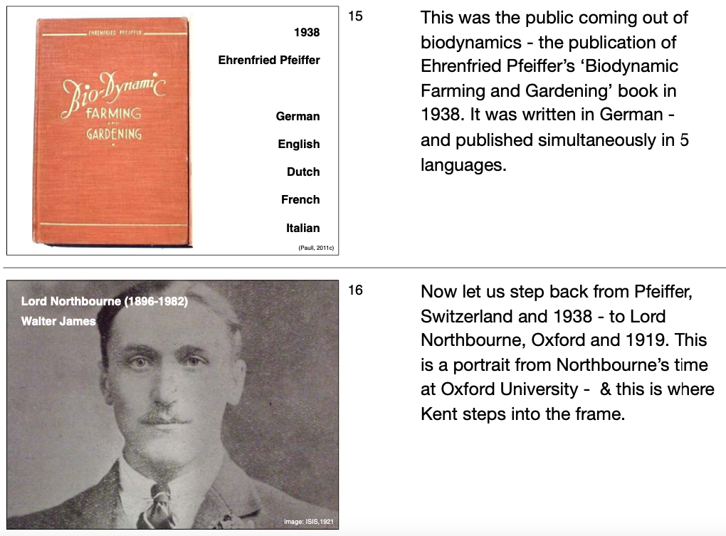 Issue de lâanthroposophe Rudolf Steiner suite aux cours aux agriculteurs (agriculture biologique)en 1924 – CâĂ©tait une rĂ©ponse prĂ©coce Ă la prolifĂ©ration de lâagriculture chimique (engrais azotĂ©s synthĂ©tiques « Haber-Bosch », etc.). AprĂšs une gestation de 15 ans, elle devient aprĂšs des expĂ©rimentations scientifiques au long court la biodynamie en 1938 grĂące E. Pfeiffer. Elle donne enfin naissance Ă l’agriculture biologique – bio, en 1940 avec Lord Northbourne.