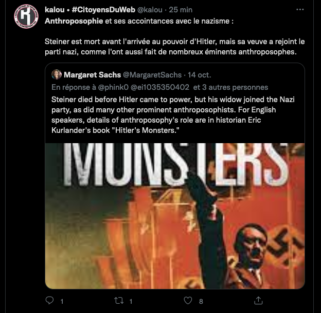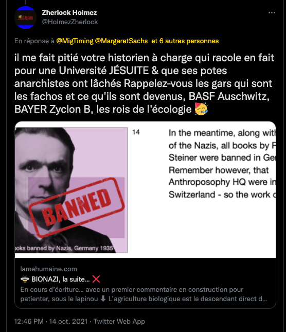 https://lamehumaine.com/2021/10/14/lanthroposophie-et-sa-meute-haineuse/ & https://lamehumaine.com/2020/07/13/rudolf-steiner-en-terre-sainte/ ⊠rappel dâune discussion rĂ©cente : Pour kakaproute et ses amis Ă©crire et dire des abjects mensonges rĂ©visionnistes sont un devoir. Comparer un humaniste gauchiste traitĂ© de juif par les nazis et leur maitre Hitler qui lui voulait la peau. GP aime. https://twitter.com/HolmezZherlock/status/1449356710255210498?s=20 & https://twitter.com/HolmezZherlock/status/1448575807991996418?s=20 & https://twitter.com/HolmezZherlock/status/1448557818420895744?s=20 & https://twitter.com/HolmezZherlock/status/1448329071847526401?s=20 & https://twitter.com/HolmezZherlock/status/1448352131455590407?s=20 & jâaime lâHistoire de lâanthroposophie en Terre Sainte, qui fĂ»t le pays ou jâhabitais durant ma jeunesse. https://twitter.com/HolmezZherlock/status/1448363648284508160?s=20