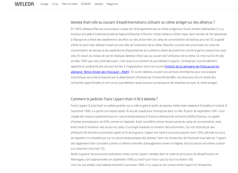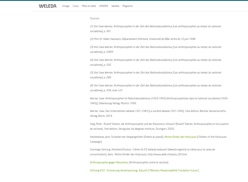 J’invite cette prof syndicaliste qui fait de la retape pour la zĂ©tĂ©tique et qui agresse* les publications Weleda et anthroposophique en permanence, Ă vouloir Ă tous prix salir ces entitĂ©s qui ont toujours luttĂ© contre: Le Parti national-socialiste: A revisiter son histoire… * https://lamehumaine.com/2021/05/01/les-detracteurs-de-lanthroposophie-suite-les-glandus-vs-les-moldus/ & * https://lamehumaine.com/2020/09/27/ca-pue-du-bec/ et a se poser de vraies question quant Ă ses engagements par accointances avec l’agro-pĂ©trochimie Ă©cocidaire du moment qui a un trĂšs mais alors trĂšs trĂšs lourd passĂ© et responsabilitĂ© avec la solution finale… En effet en Allemagne sur 8000 membres de la sociĂ©tĂ© anthroposophique qui fut interdite dĂšs 1935: 45 en tout et pour tout ont rejoins les nazis et consorts, c’est fort regrettable mais c’est toutefois un pourcentage trĂšs faible quand Ă la population gĂ©nĂ©rale, explications: https://www.aether.news/transparence-anthroposophie/… L’interdiction de l’anthroposophie pendant la pĂ©riode nazie signifiait que Weleda en Allemagne (SchwĂ€bisch GmĂŒnd) Ă©tait Ă©galement confrontĂ©e Ă une menace pour son existence. Werner explique comment l’entreprise a nĂ©anmoins rĂ©ussi Ă survivre au rĂ©gime nazi et aux annĂ©es de guerre relativement indemnes. D’une part parce qu’elle Ă©tait la branche d’une entreprise suisse et d’autre part Ă cause de ses fondements spĂ©cifiquement anthroposophiques: ceux-ci s’Ă©tendaient jusqu’Ă la structure sociale de l’entreprise et formaient un contrepoids spirituel au fascisme en Europe. – Les recherches historiques concernant la livraison par la Weleda de la crĂšme contre les engelures Ă Munich, qui aboutit au camp de Dachau pour des expĂ©rimentations inhumaines sur les internĂ©s, ont montrĂ© que lâentreprise nâĂ©tait pas au courant de cette destination et de cette utilisation. (13) DĂšs lors, comment peut-on affirmer que Weleda ait Ă©tĂ© complice dâune quelconque façon de ce crime sordide ? –