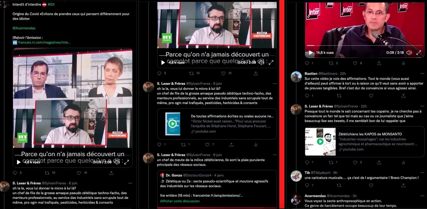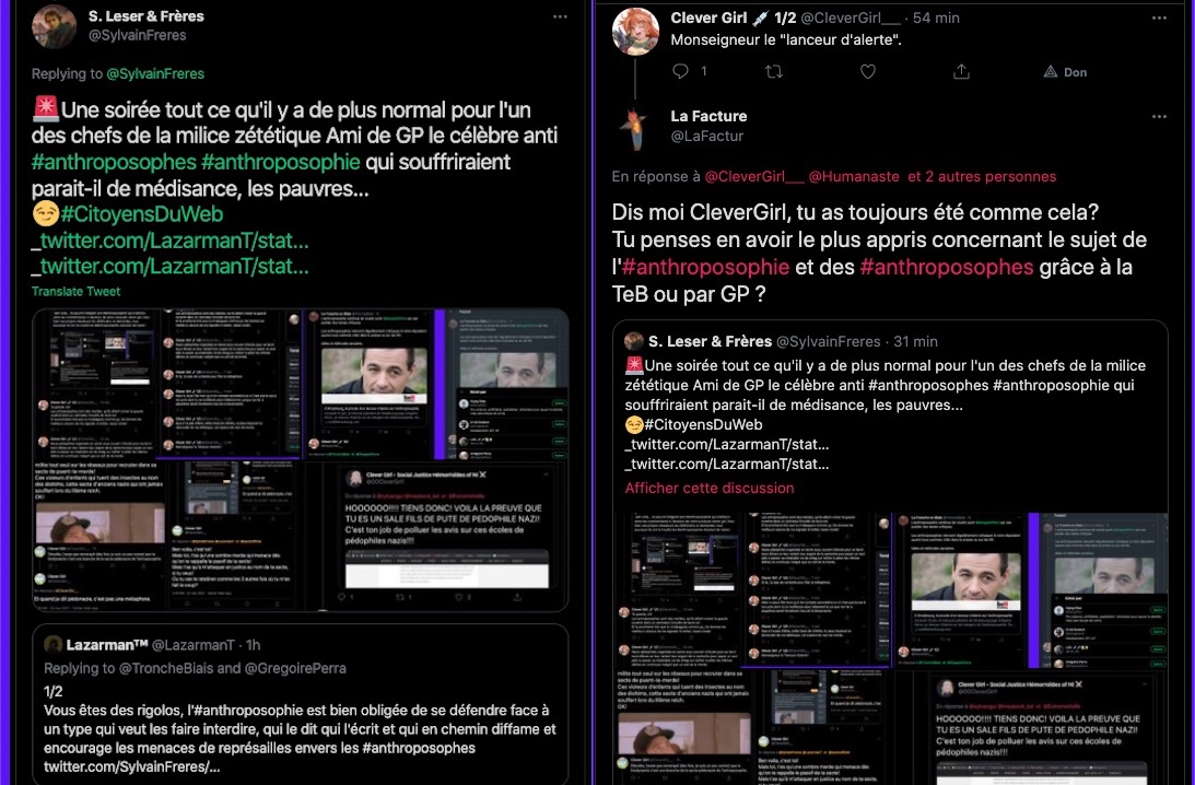 Ces fameux CitoyensDuWeb et la garde rapprochée de GP… Tout de même, ils se font malmener par les méchants anthroposophes, c’est inadmissible! Suite de leur conversation avec quelques intervenants qui trainent aux abords de ‘la tronche en biais’ et ce ne sont vraiment pas les seuls à être dans le style, les geeks du genre sont légions. Cela me fait sourire lorsque je les vois raconter que la vie est dure pour les gardiens de la raison qui subiraient des pressions et des menaces… Ils fabriquent même des fausses menaces, ..qui elles seraient difficilement présentables en justice. C’est juste pour le buzz et les merdias qui leur donnent un balcon!