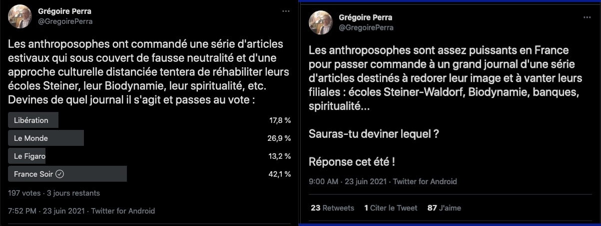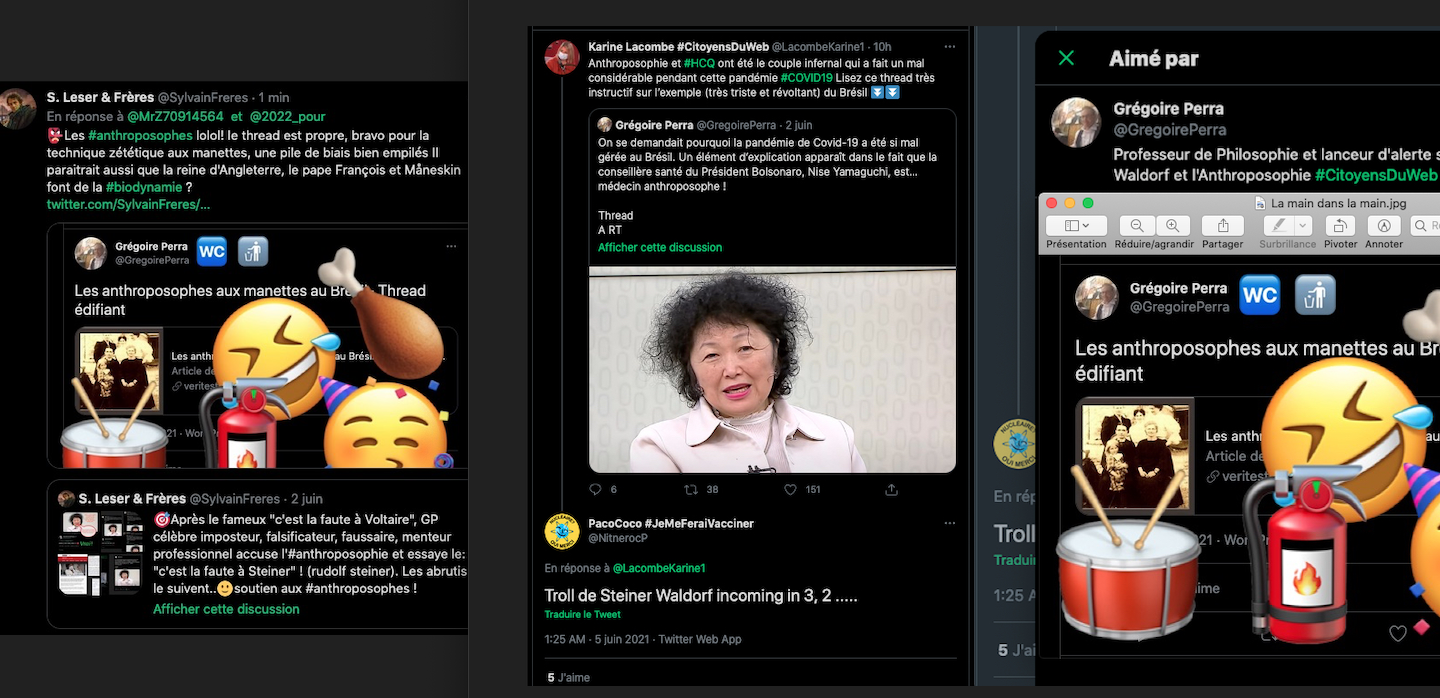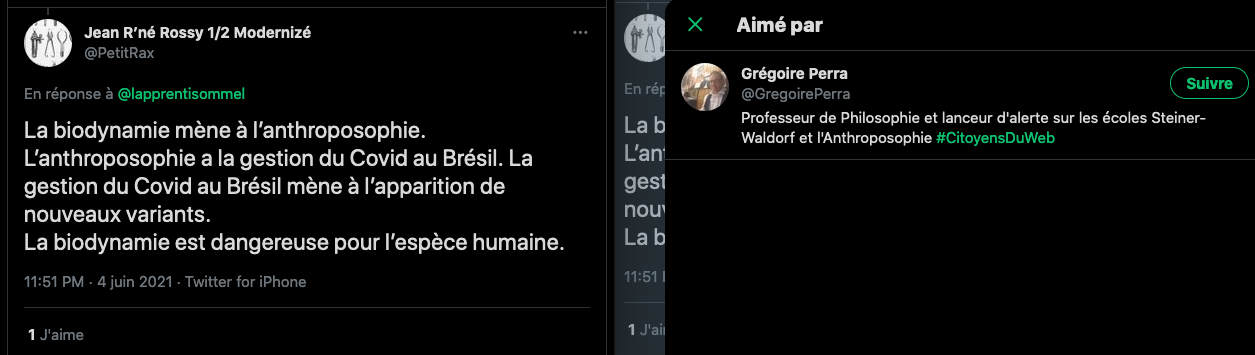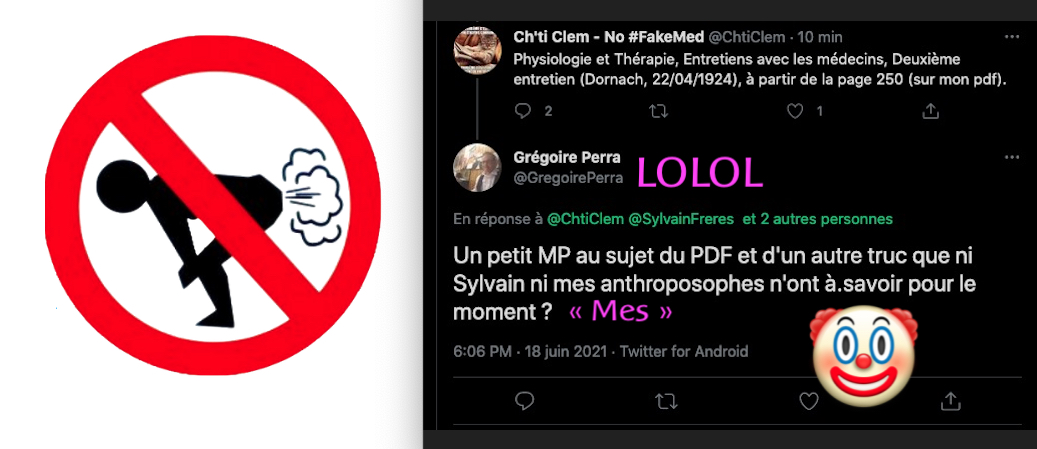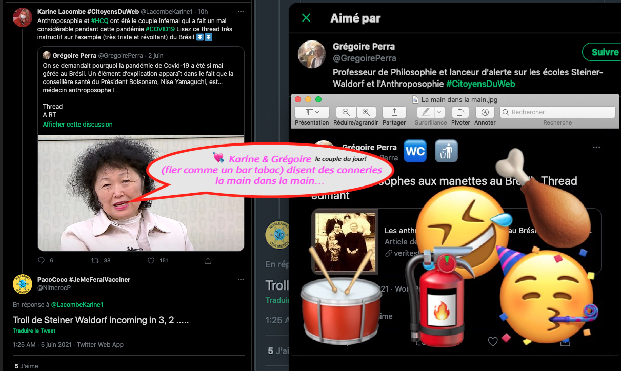 Comme vous avez pu le constater, Grégoire Perra a fait un tweet dont il est très fier ! Son truc est repris par la tribu Ze (zététichienne) …et en tête actuellement, vous avez Karine Lacombe. Ça la fout mal pour la crédibilité de cette personne, …mais les nigauds s’enfournent. Le message qu’il veut faire passer est le suivant ⬇︎. Le truc qui est à noter, c’est qu’il y a 500 retweets en gros, des retweets cités, des milliers de commentaires et c’est pas fini… Que vont faire et dire les anthroposophes? 🤣 qui je le rappelle, ne savent ou ne veulent pas se servir de Twitter… Perso, je leur conseille de creuser une tranchée autour du fameux Goetheanum, de s’entrainer au combat rapproché, de faire des provisions et de débrancher le wifi… moa, je me barre à Rio pour profiter du carnaval et je rejoins le maquis…