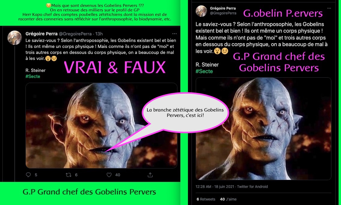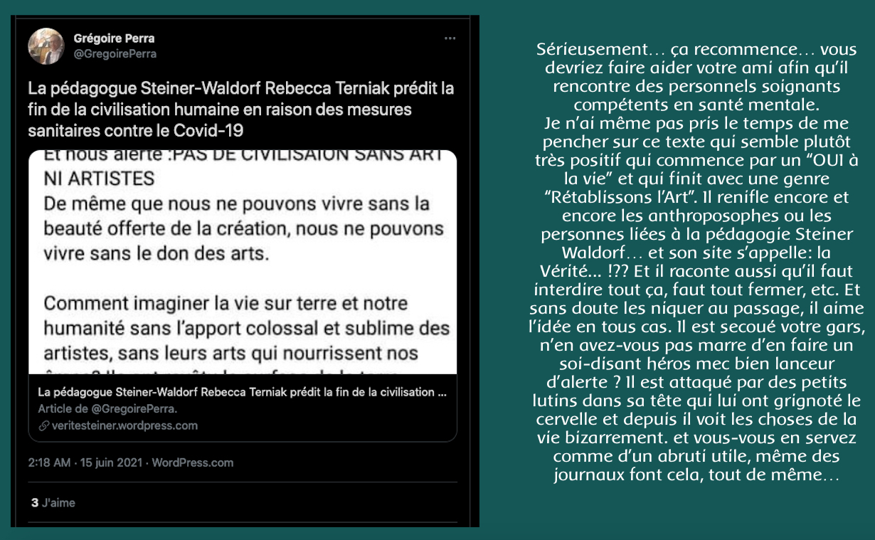 Grégoire Perra, pour tenter d’atténuer sa boulette du jour qui mériterait une plainte, tente à nouveau une esbroufe: il vient de s’écrire un commentaire et raconte que c’est un anthroposophe qui lui aurait envoyé cela ce qui est faux ! Les commentaires sur les blogs comme le sien, affiche l’adresse email et donc l’IP de celui qui commente. ⤦ mais c’est bien, il a une pointe de dérision sur lui-même, on sent aussi qu’il déteste la Terre entière et lui en premier…