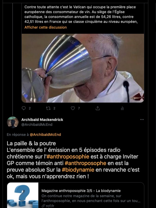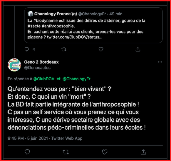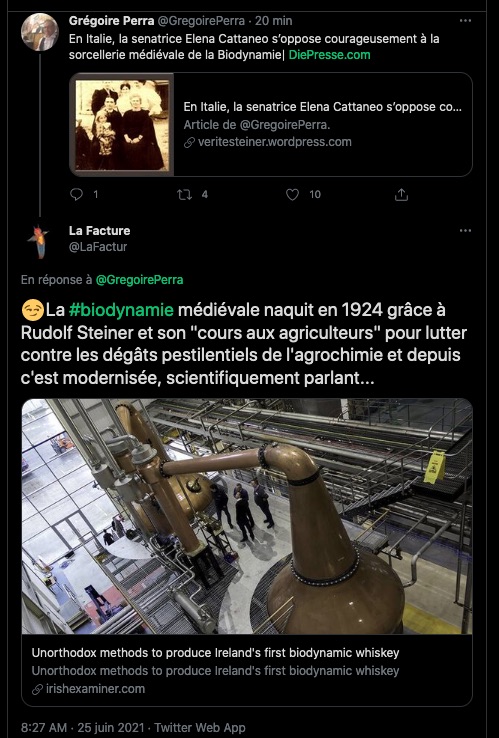 La meute reprend son train-train et s’attaque à nouveau à la biodynamie. C’est circulaire et s’ils le font, c’est qu’il y a une sorte de contrat d’astroturfing, une raison d’être et de faire. Étant basé sur la duplicité et la dissimulation, seule l’application des lois contre les infractions au commerce peuvent les stopper, …je ne connais pas bien ce dossier sur la législation. Mais il me semble que la France est à la traîne. En Allemagne, je ne vois pas cela sur le réseau. Si vous tapez « biodynamic » dans la barre de recherche, vous ne verrez rien de similaire. Ça doit être une spécialité de collabos bien de chez nous! Les voici à l’œuvre ⬇︎ la même éternelle RACAILLE.