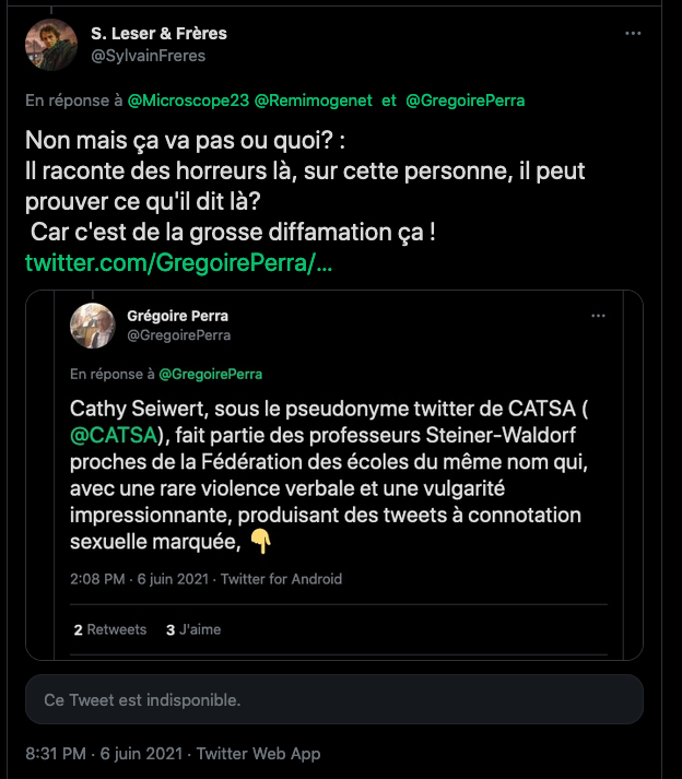 Nouvelle immonde bévue de Grégoire qui devient de plus en plus venimeux en diffamation ! Je le mets au défi de prouver que @ CATSA est cette madame Cathy Seiwert !!!