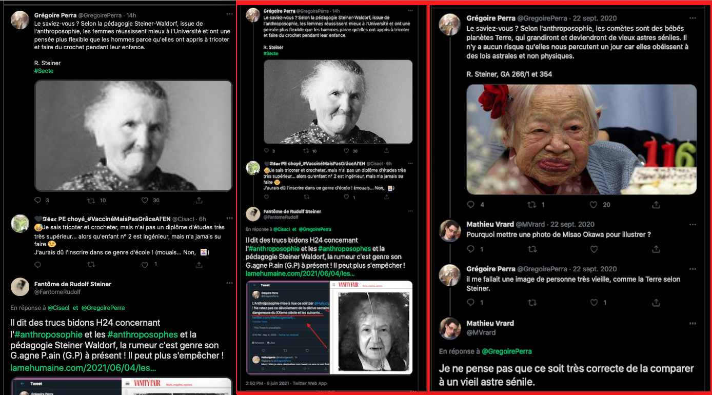 Pour documenter ses propos bizarres, il fait des choix bizarres. Hier c’était de détourner l’image d’une adolescente fugueuse, image qu’il a prise sur le net, comme bon cela lui chantait, sans vérifier d’ailleurs la source de cette photographie qui vient d’une alerte justice pour retrouver la personne… c’est glauque. ⤦ https://lamehumaine.com/2021/05/01/les-detracteurs-de-lanthroposophie-suite-les-glandus-vs-les-moldus/ et là à nouveau une vieille dame et toujours avec son petit: # Secte, dont il est très fier, la plus dangereuse au monde parait-il? Il est bizarre ce type...