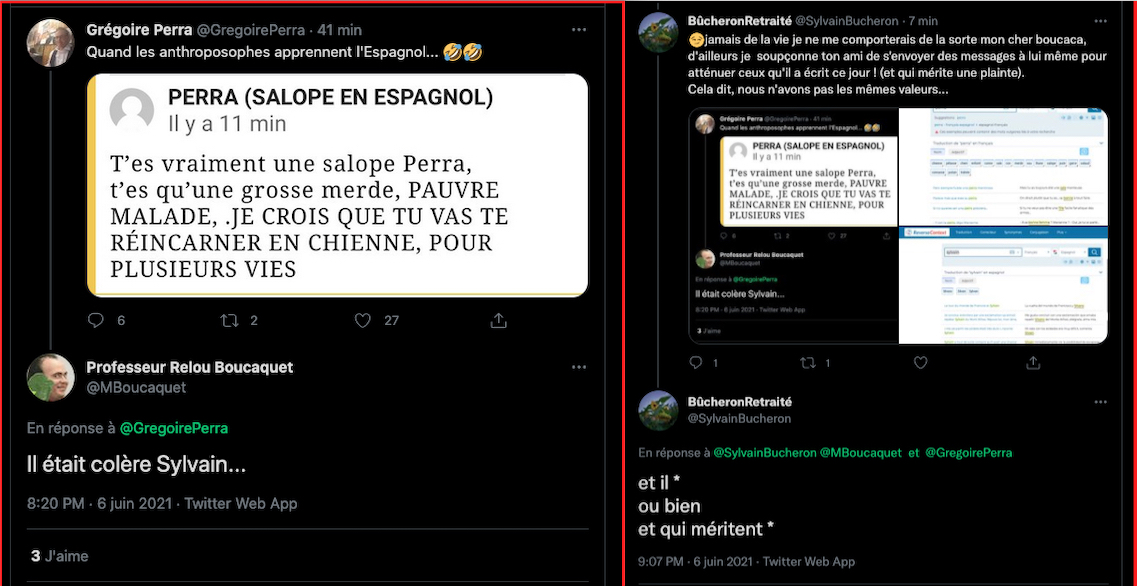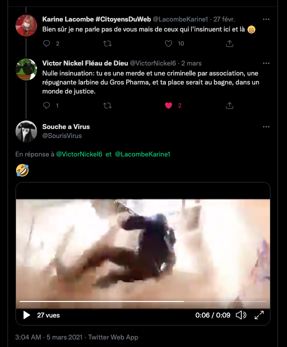 Donc, en effet elle se fait parfois insulter. Là, j’avais mis une descente du FBI en Gif à Victor, avec un sourire (smiley), car de temps à autre il craque sur ces personnes qu’il a observées depuis des années et il met un vulgaire coup d’argot châtié. Mon intervention stipulait qu’avec l’insulte, il prenait le risque de se faire bloquer sur Twitter et cela se produisit quasiment séance tenante. Dommage, ses interventions hors insultes sont passionnantes.⇣- Je vais tout de même aller fouiller plus loin, pour savoir ce que les personnes lui reproche…