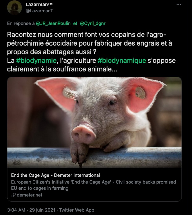 Sinon il y a l’abruti dégénéré zététicien qui essaye de faire passer les biodynamistes pour des bourreaux d’animaux, c’est un de leur nouveau truc, mais ils se plantent et se démasquent… Voici mon genre de réponses pour l’instant ⬇︎