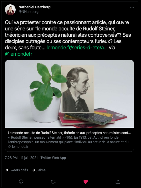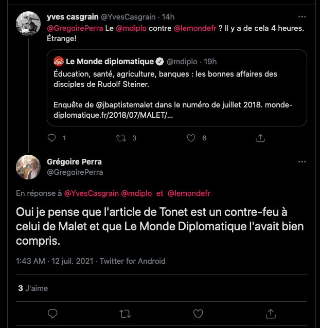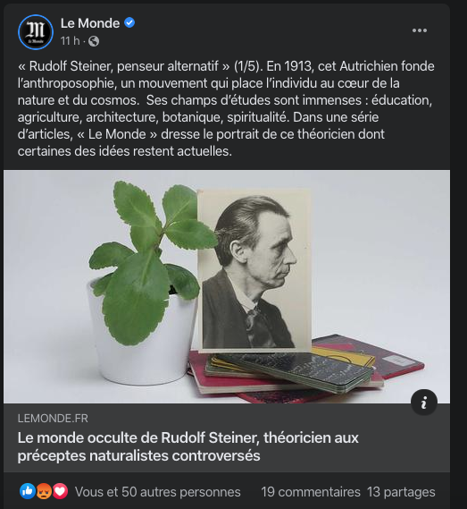 Le Monde diplo remet en avant son article assassin de 2018: celui qui a incité les meutes de trolls à insulter gravement les anthroposophes. J’ai vu ça lorsqu’ils l’ont re publié hier puis lorsqu’il ont mis en avant cet aprem le jeune Roglaude ( pro zététique) et j’ai la confirmation par le Kapo GP..
