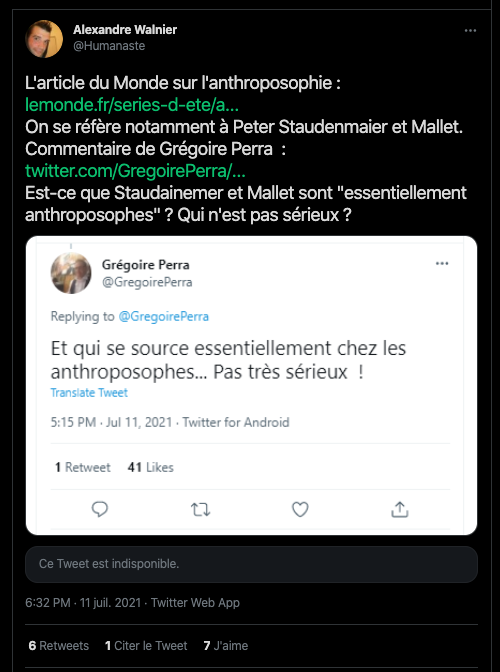 m’envoie des tweets et les efface aussitôt. J’aurais une secte à moua !?? et qui fait des menaces comme il dit? et le Monde n’a pas lu Steiner et c’est là d’où tout vient et de ma TL. Je vais me faire un café, j’arrive.. https://twitter.com/SylvainFreres/status/1415882648510140417?s=20