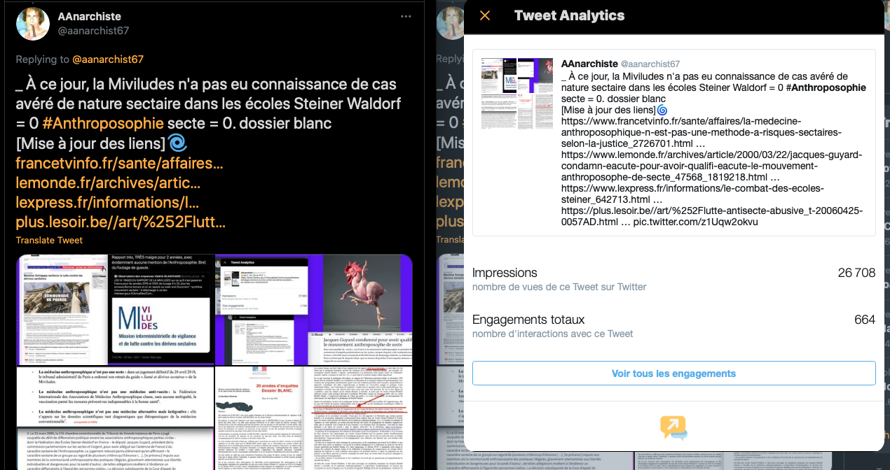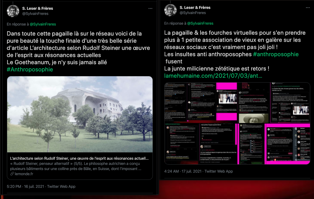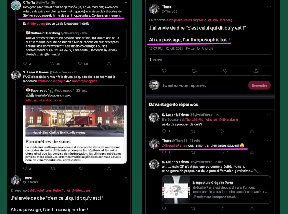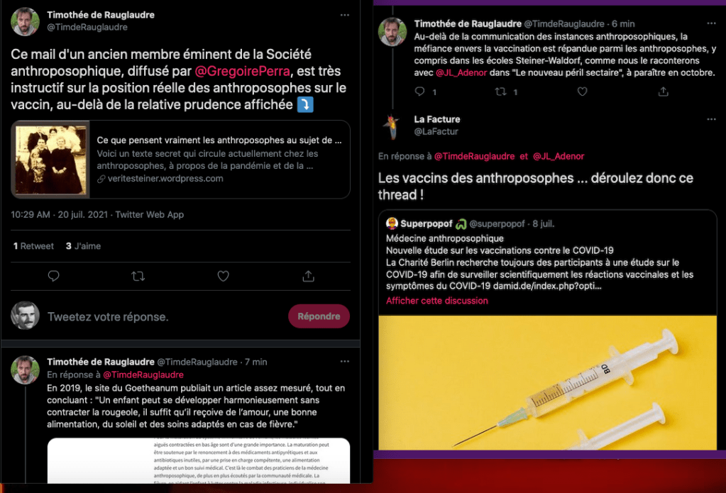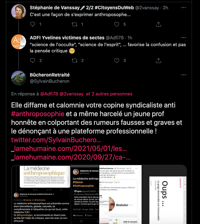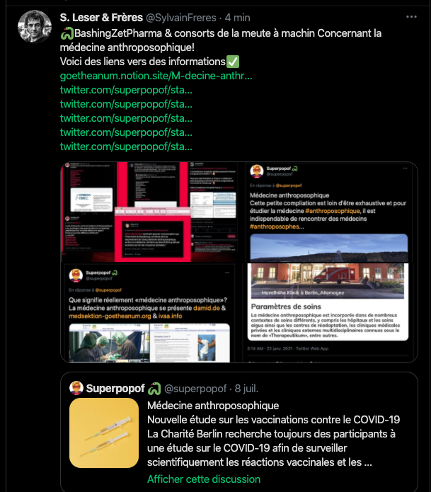 Sur Twitter il n’y en a quasiment pas d’anthroposophe et sur Facebook, il n’existe que des groupes de discussions autour de l’œuvre faramineuse de Rudolf Steiner. Il y a bien quelques pages à propos des écoles, de leur vie et des pages étrangères sur la médecine anthroposophique qui a pignon sur rue dans le milieu hospitalier à l’étranger même si cela n’est pas énorme. De nombreuses structures existent et c’est juste idiot que d’avoir à aller se soigner loin de la maison : ce n’est pas toujours réalisable : https://anthro-kliniken.de/deutschland.html & https://www.ivaa.info/about-anthroposophic-medicine/care-settings/. Les détracteurs racontent toute la journée et partout que la médecine d’orientation anthroposophique serait antivax alors que Rudolf Steiner préconisait le fait de se faire vacciner l’ayant été lui-même pour la variole : https://twitter.com/superpopof/status/1382278760565719043?s=20. De nombreux communiqués sont faits à ce sujet mais pour eux c’est seulement la rumeur qui compte : la réalité factuelle ils n’en ont que faire : leur mission étant la désinformation outrancière. https://www.ivaa.info/latest-news/ & https://goetheanum.co/fr/nouvelles/wie-stellen-wir-uns-weltweit-zum-thema-impfen & https://damid.de/presse/pressmitteilungen/925-keine-versteckte-impfpflicht-fuer-kinder-und-jugendliche.html?fbclid=IwAR0kKYo0TFGnobwTdGCHxlMcKxa5Xjb3dSPHhnaxp5PErA2f_2qu2D-p-Ks…