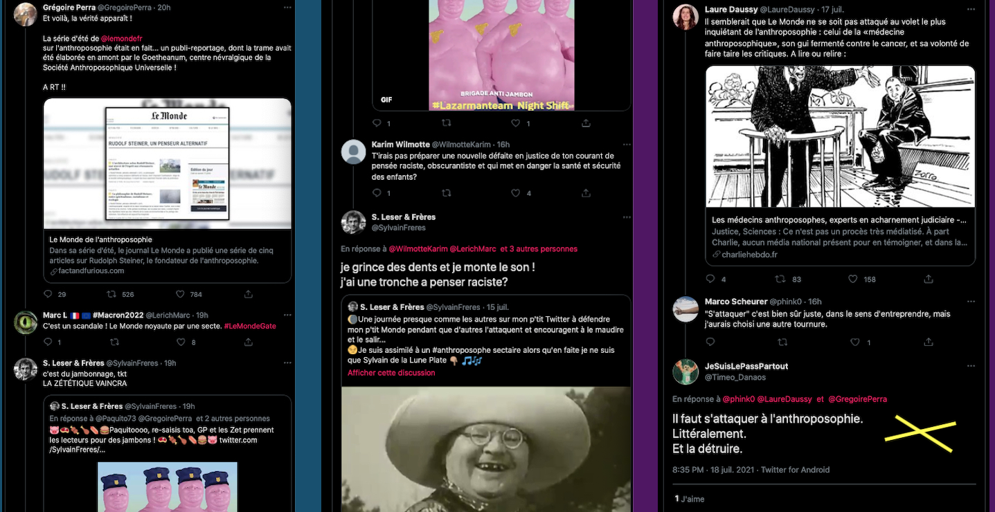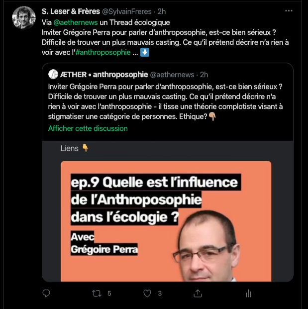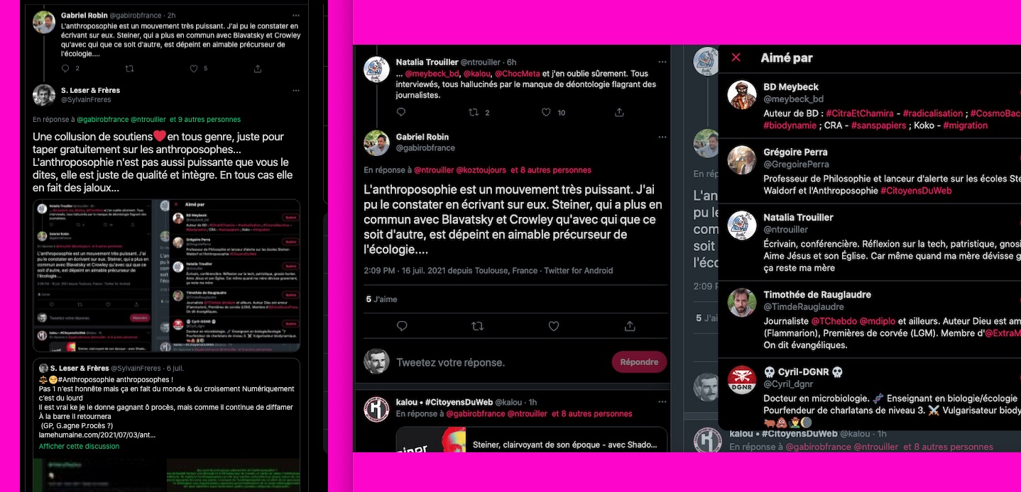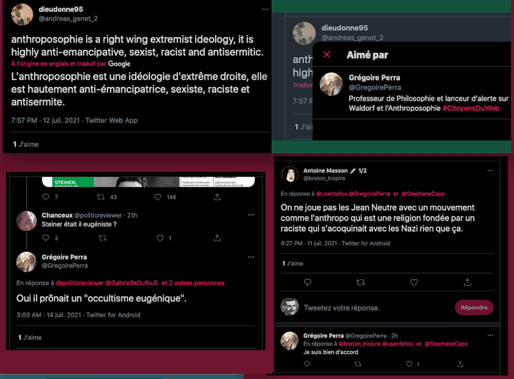 Sur Twitter il n’y en a quasiment pas d’anthroposophe et sur Facebook, il n’existe que des groupes de discussions autour de l’œuvre faramineuse de Rudolf Steiner. Il y a bien quelques pages à propos des écoles, de leur vie et des pages étrangères sur la médecine anthroposophique qui a pignon sur rue dans le milieu hospitalier à l’étranger même si cela n’est pas énorme. De nombreuses structures existent et c’est juste idiot que d’avoir à aller se soigner loin de la maison : ce n’est pas toujours réalisable : https://anthro-kliniken.de/deutschland.html & https://www.ivaa.info/about-anthroposophic-medicine/care-settings/. Les détracteurs racontent toute la journée et partout que la médecine d’orientation anthroposophique serait antivax alors que Rudolf Steiner préconisait le fait de se faire vacciner l’ayant été lui-même pour la variole : https://twitter.com/superpopof/status/1382278760565719043?s=20. De nombreux communiqués sont faits à ce sujet mais pour eux c’est seulement la rumeur qui compte : la réalité factuelle ils n’en ont que faire : leur mission étant la désinformation outrancière. https://www.ivaa.info/latest-news/ & https://goetheanum.co/fr/nouvelles/wie-stellen-wir-uns-weltweit-zum-thema-impfen & https://damid.de/presse/pressmitteilungen/925-keine-versteckte-impfpflicht-fuer-kinder-und-jugendliche.html?fbclid=IwAR0kKYo0TFGnobwTdGCHxlMcKxa5Xjb3dSPHhnaxp5PErA2f_2qu2D-p-Ks…
