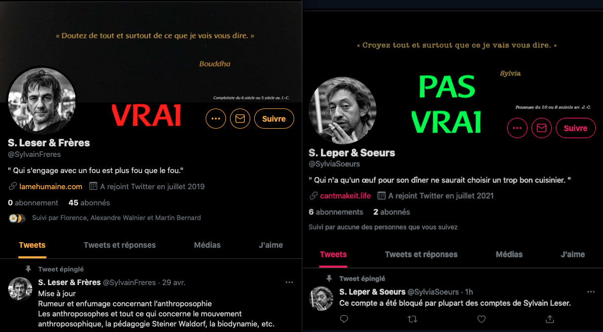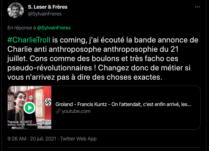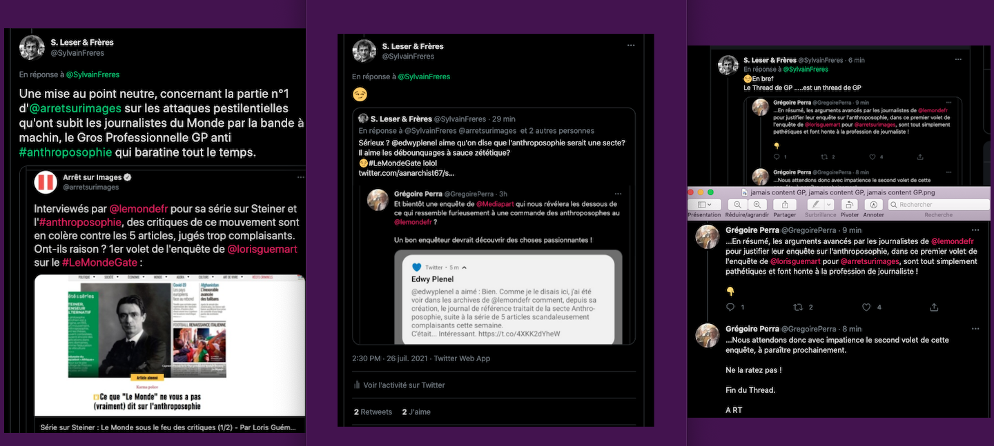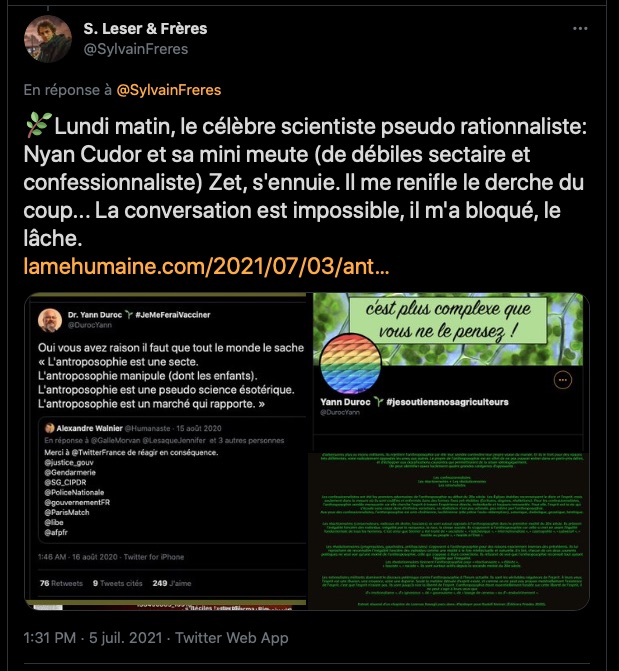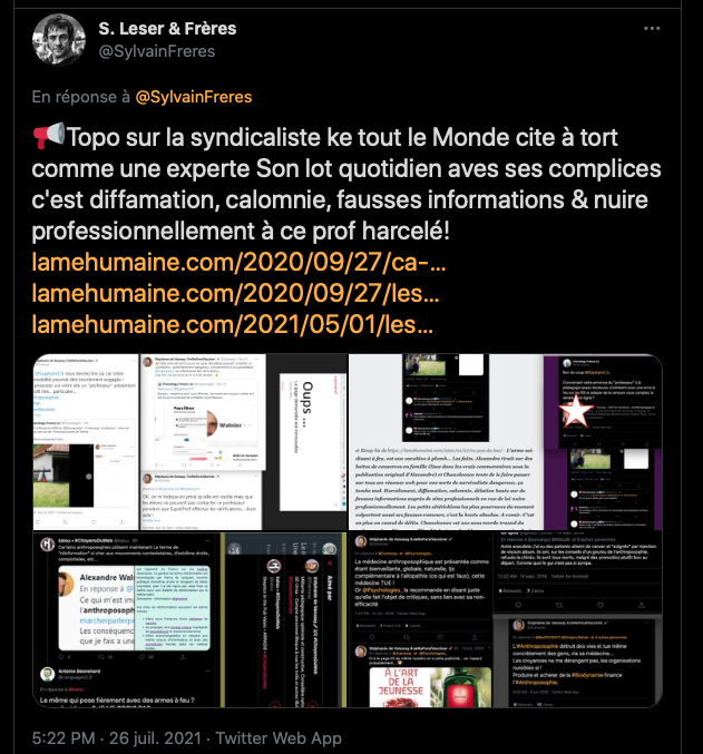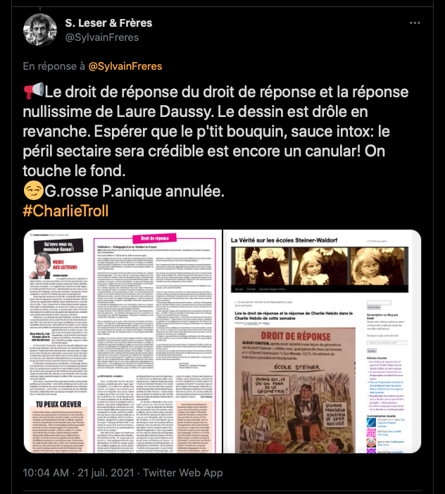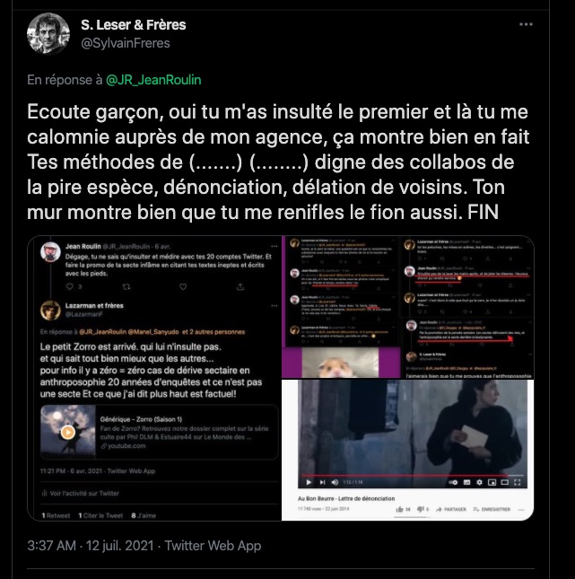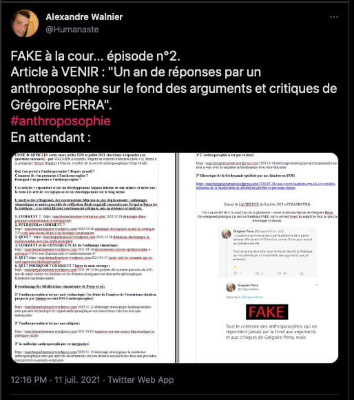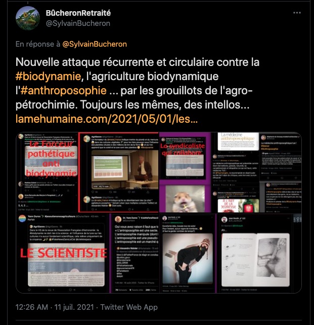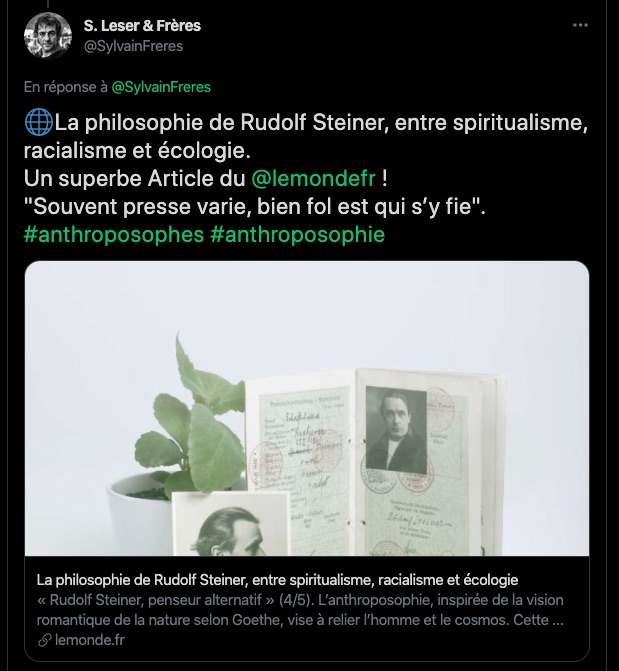Il paraît que les anthroposophes auraient commandé à des quotidiens de presse nationale des reportages en leur faveur. Vue de sa fenêtre, la presse ne serait loyale et de bonne qualité que si elle répète ses sempiternelles boniments. Ceux du témoin unique, chef et gourou des autres témoins, toujours les mêmes d’ailleurs et ce depuis des lustres… rien de neuf ! Hâte tout de même de savoir quels sont les journalistes qui tremperaient dans les magouilles, soudoyés et achetés par les posophes… c’est pour cet été paraît-il ! J’espère, si cela est vrai, que des courageux médias feront un boulot avec justesse et exemplarité : des choses exactes seraient bienvenues. Je souhaite, en mon for intérieur, une mise en lumière du système que les anthroposophes du web subissent de la part de la junte techno-facho d’en face ! https://twitter.com/SylvainFreres/status/1407776732174819328?s=20.