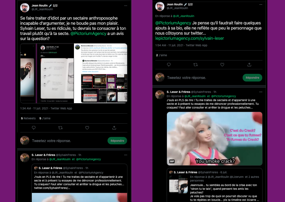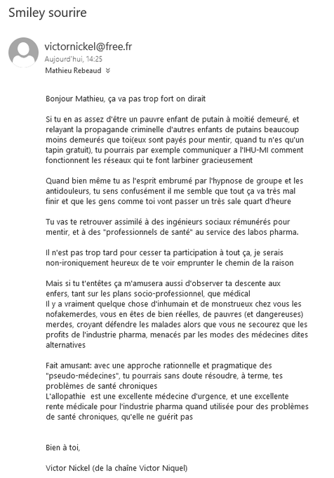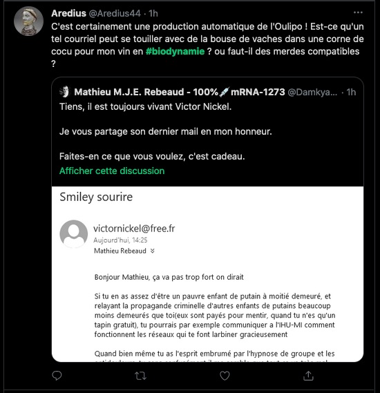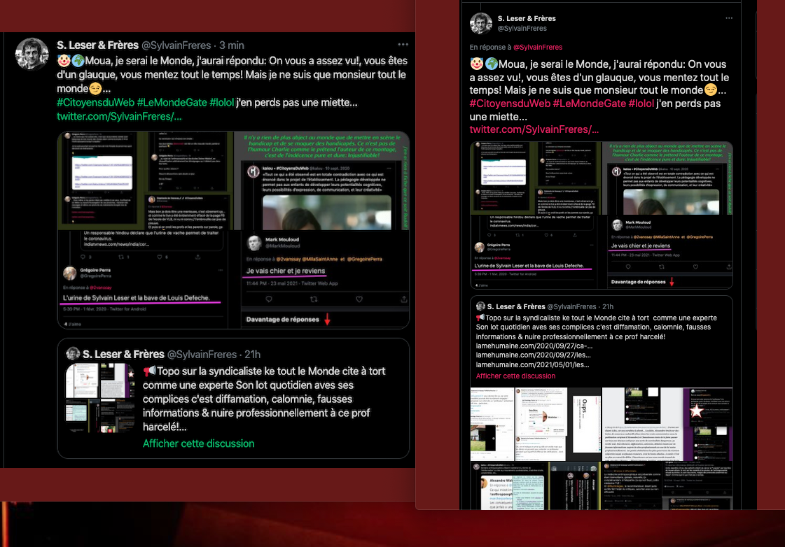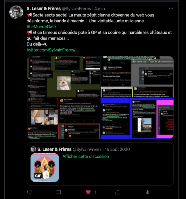 Ces temps-ci, quelques journaleux, fans de zététique ont à nouveau bien chargé la mule : ils ont même émis des mensonges avérés, droits dans leurs bottes sur quelques plateaux télé… avec une émission sur les complots, faute de scoop ils en inventent ! Comme les nombreuses menaces et insultes que ces personnes reçoivent, paraît-il. C’est pourtant eux qui les font à autrui et qui se plaignent du contraire, c’est une de leurs techniques. Je pense même qu’ils en fabriquent de toute pièce de ce genre de fausses insultes et diffamations… à un moment donné, la supercherie devient visible! Au quotidien, je suis victime de ces calomnies, de ces menaces de représailles, d’insultes… les preuves sont flagrantes ! De cela, personne ne doute ni n’oubliera ! https://twitter.com/SylvainFreres/status/1406956217239588866?s=20 & https://twitter.com/LaFactur/status/1389145997566259201?s=20 & https://twitter.com/SylvainFreres/status/1402711755017445376?s=20…
