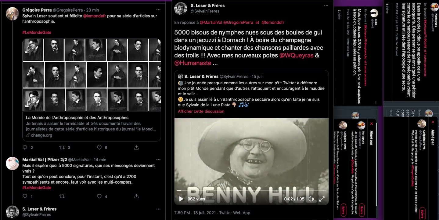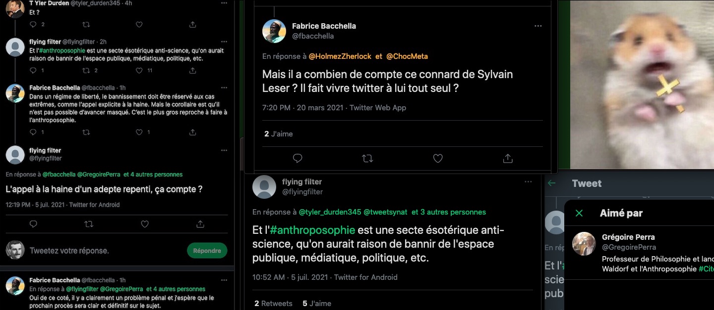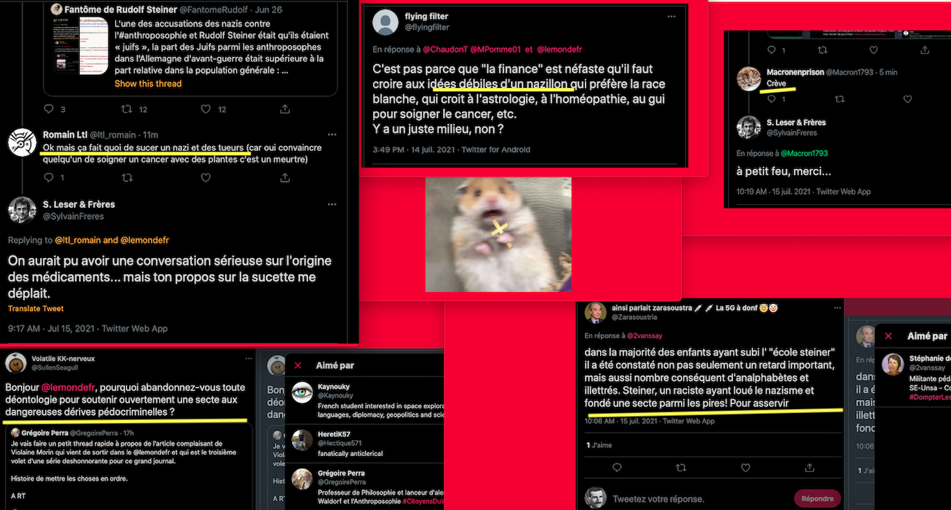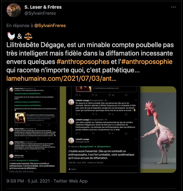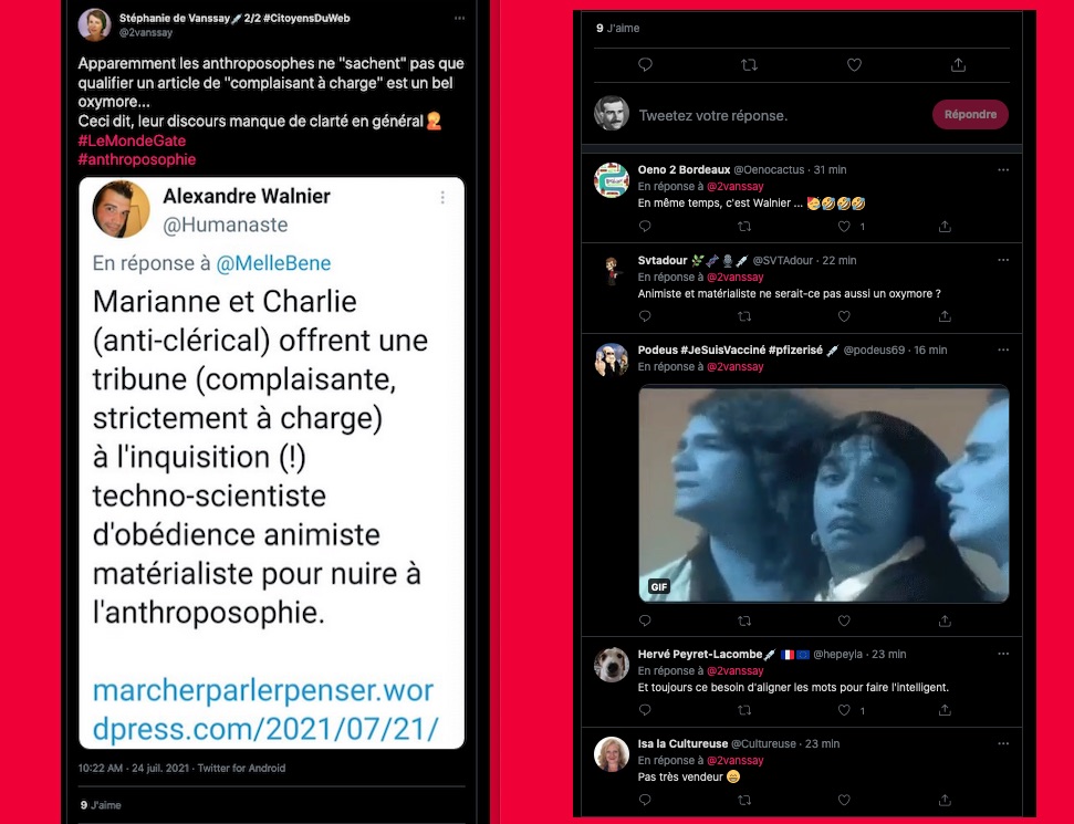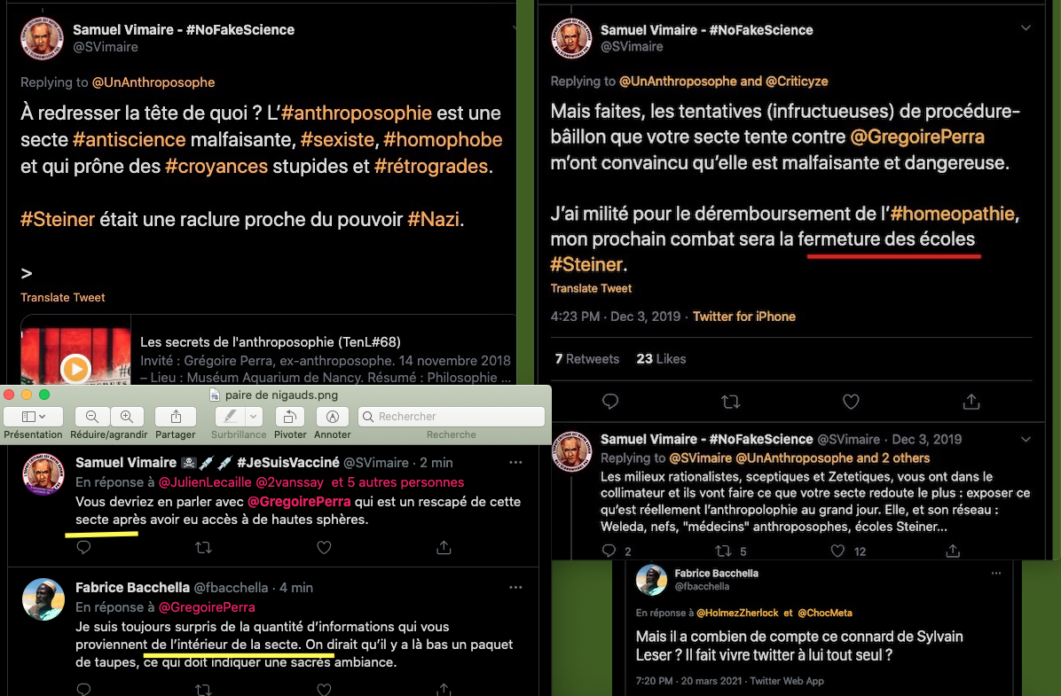Bravo et Merci Marianne ! Les zététiciens et consorts, la meute habituelle quoi, que des gens sympas, histoire de dire des choses exactes. Adenor et ses amis du réseau, lolol. La junte milicienne. – j’arrive pas à croire que la haine des anthroposophes(des gens plutôt très sympa)se cristallise ainsi chez Marianne ce jour! La junte milicienne habituelle, techno-facho zététicienne, la bande à GP est de sortie. Fourche à la main! Voir mes 5 Tweets précédents: https://twitter.com/SylvainFreres/status/1418262366869934081?s=20