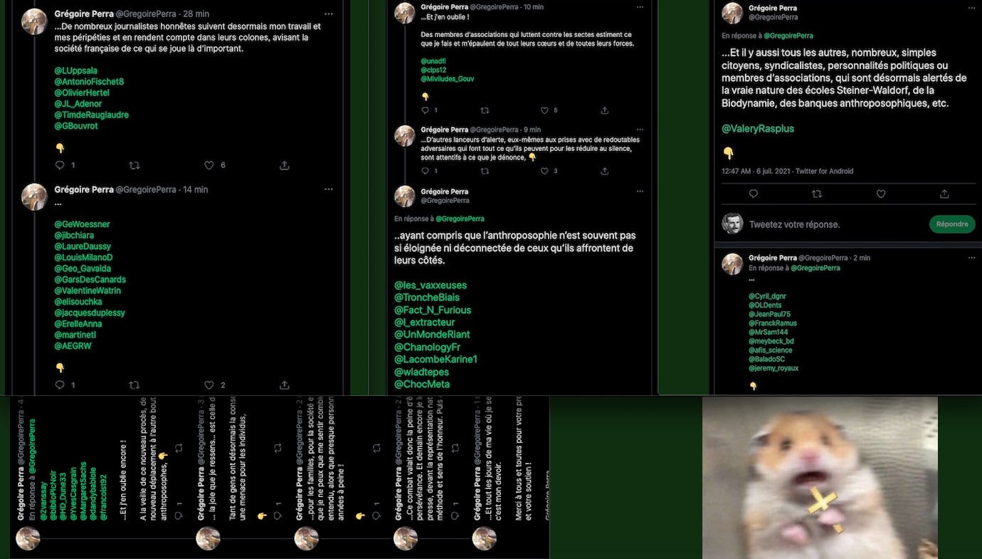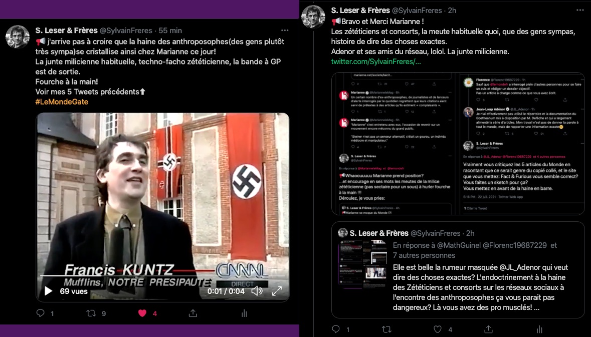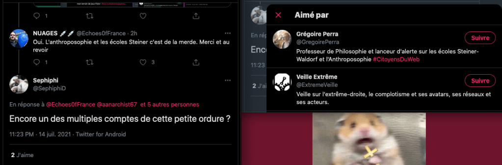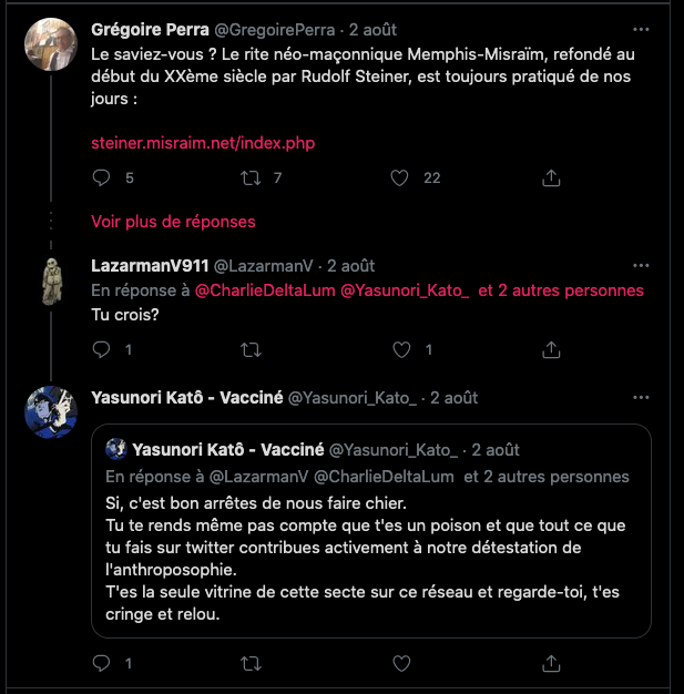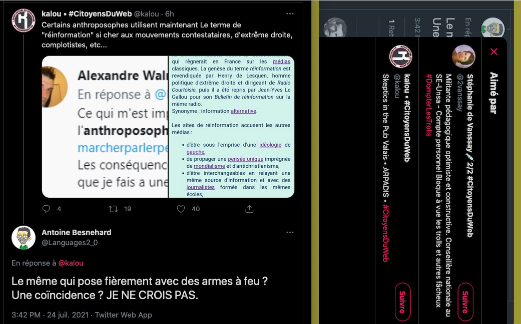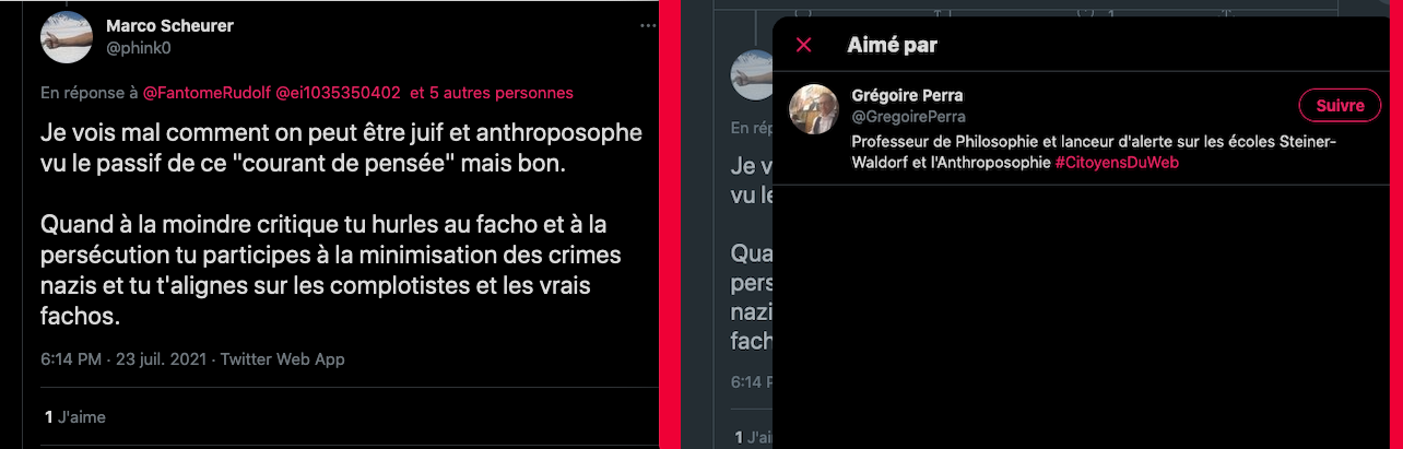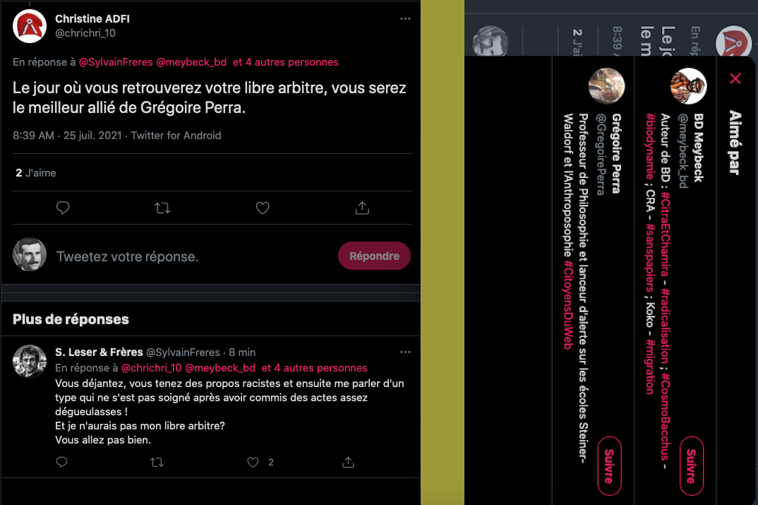 Bravo et Merci Marianne ! Les zététiciens et consorts, la meute habituelle quoi, que des gens sympas, histoire de dire des choses exactes. Adenor et ses amis du réseau, lolol. La junte milicienne. – j’arrive pas à croire que la haine des anthroposophes(des gens plutôt très sympa)se cristallise ainsi chez Marianne ce jour! La junte milicienne habituelle, techno-facho zététicienne, la bande à GP est de sortie. Fourche à la main! Voir mes 5 Tweets précédents: https://twitter.com/SylvainFreres/status/1418262366869934081?s=20
