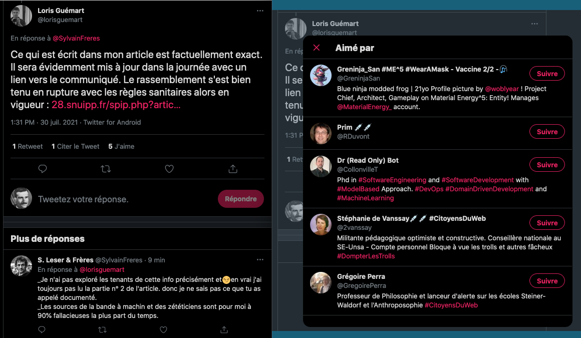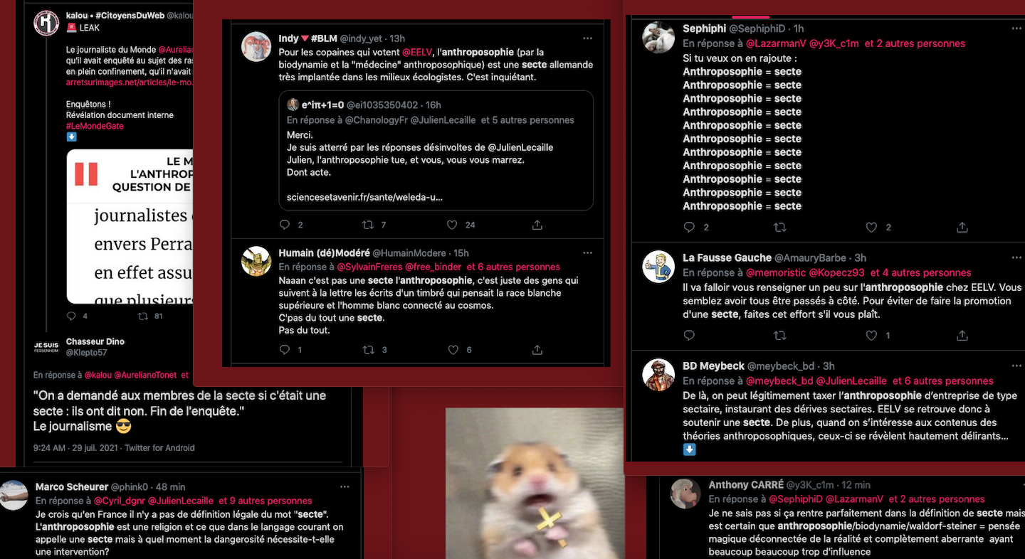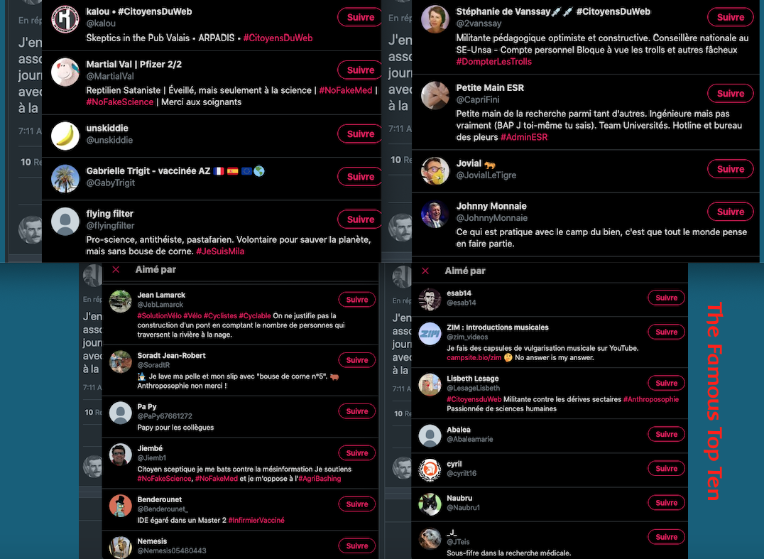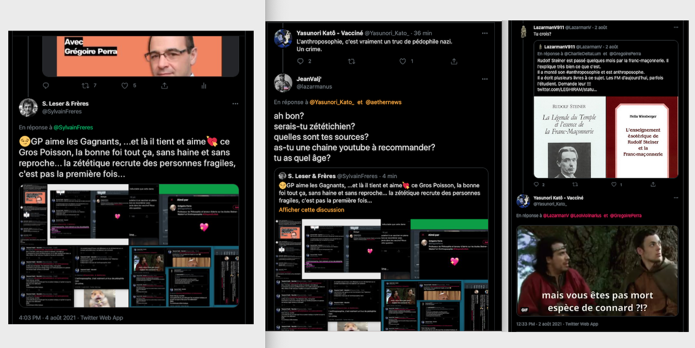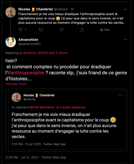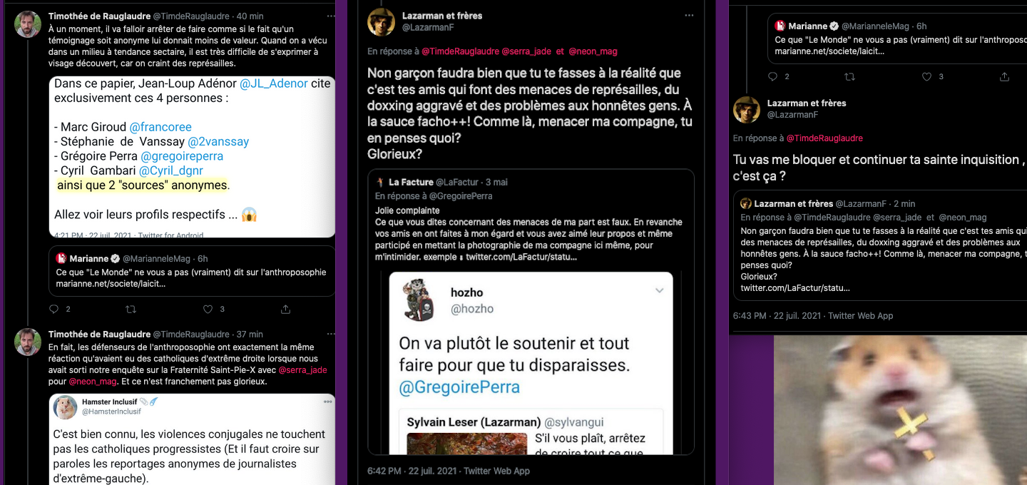Bravo et Merci Marianne ! Les zététiciens et consorts, la meute habituelle quoi, que des gens sympas, histoire de dire des choses exactes. Adenor et ses amis du réseau, lolol. La junte milicienne. – j’arrive pas à croire que la haine des anthroposophes(des gens plutôt très sympa)se cristallise ainsi chez Marianne ce jour! La junte milicienne habituelle, techno-facho zététicienne, la bande à GP est de sortie. Fourche à la main! Voir mes 5 Tweets précédents: https://twitter.com/SylvainFreres/status/1418262366869934081?s=20
