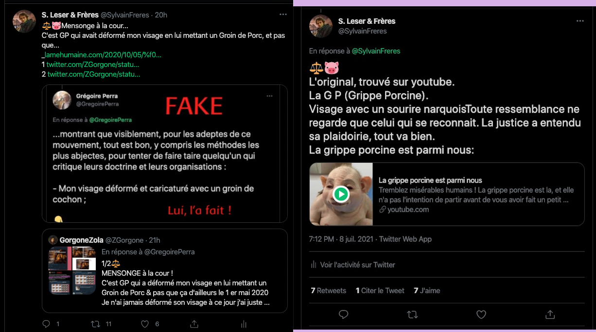 Grégoire Perra encourage son copain qui a fait un compte parodique à mon effigie à me provoquer en racontant que ce serait moi qui ai trafiqué sa tronche avec un Groin de Porc. Je ne sais pas s’ il connait bien l’histoire du livre où Perra a déconné avec la couverture… hé oui, j’aurais dû porter plainte à ce moment-là. Je pourrais encore le faire d’ailleurs, surtout s’il y a provocation avérée… ça le changera de cour de Justice, il verra enfin du beau monde et de la vraie plaidoirie, sans merci ni tralala… 😉