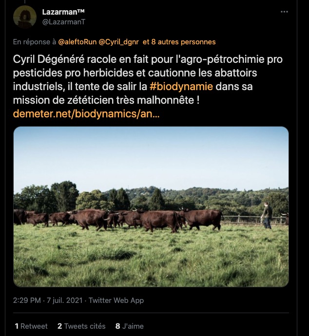 Cyril Dégénéré pro pesticides, pro herbicides, pro OGM mal trafiqués, pro zététique tente à nouveau de faire passer la biodynamie pour non-respectueuse des animaux… les mecs osent tout, c’est certain, lui il reçoit au minimum des petits cadeaux minables pour dire autant de saloperies, des sans-scrupules de l’agro-pétrochimie, je ne vois et ne peut imaginer que cela…