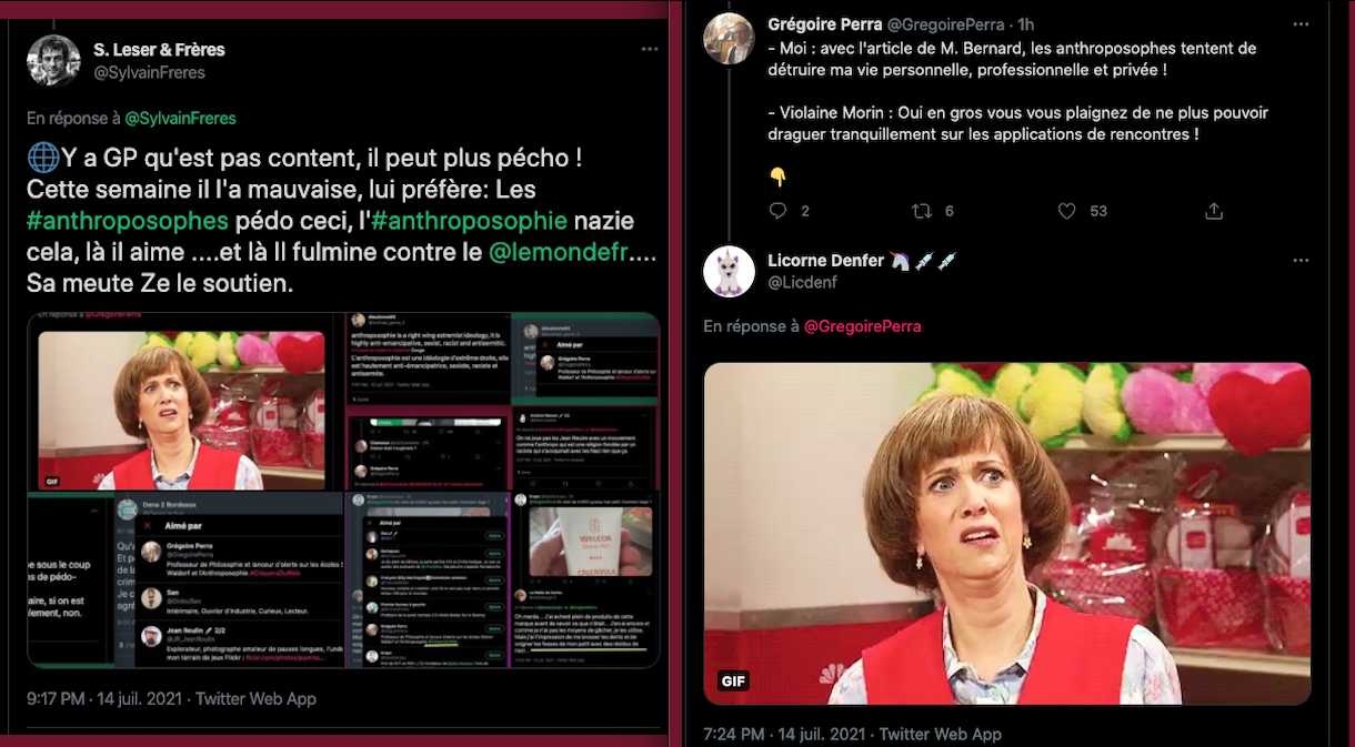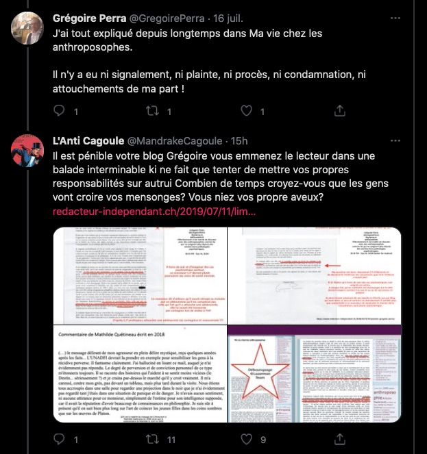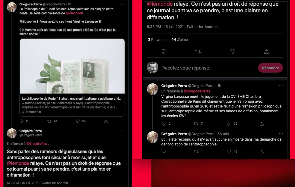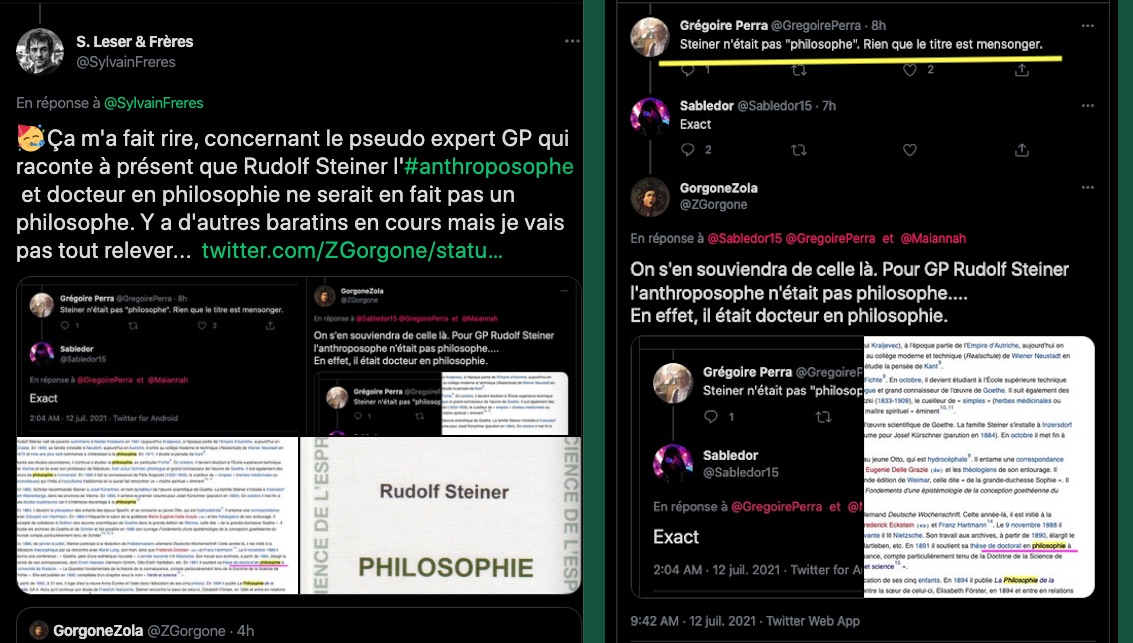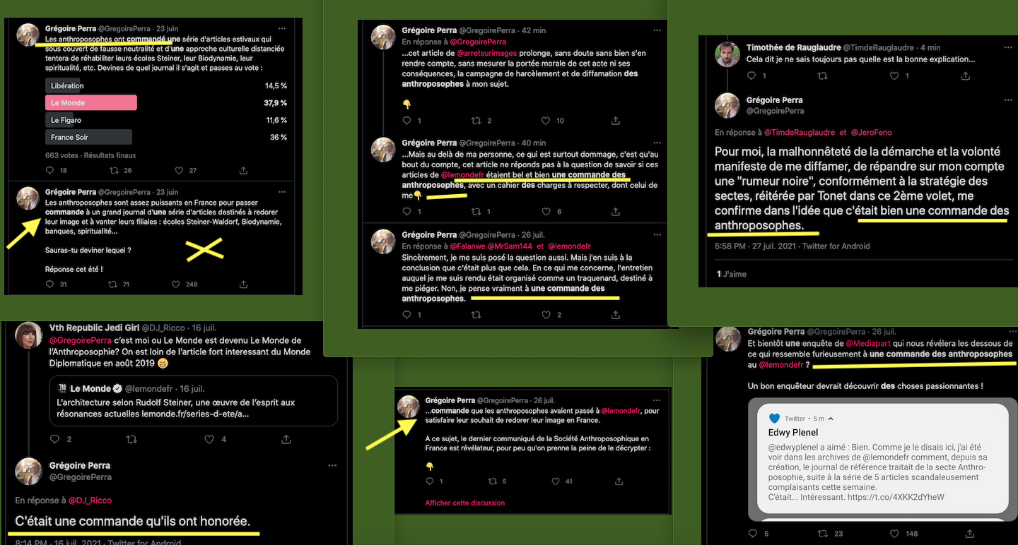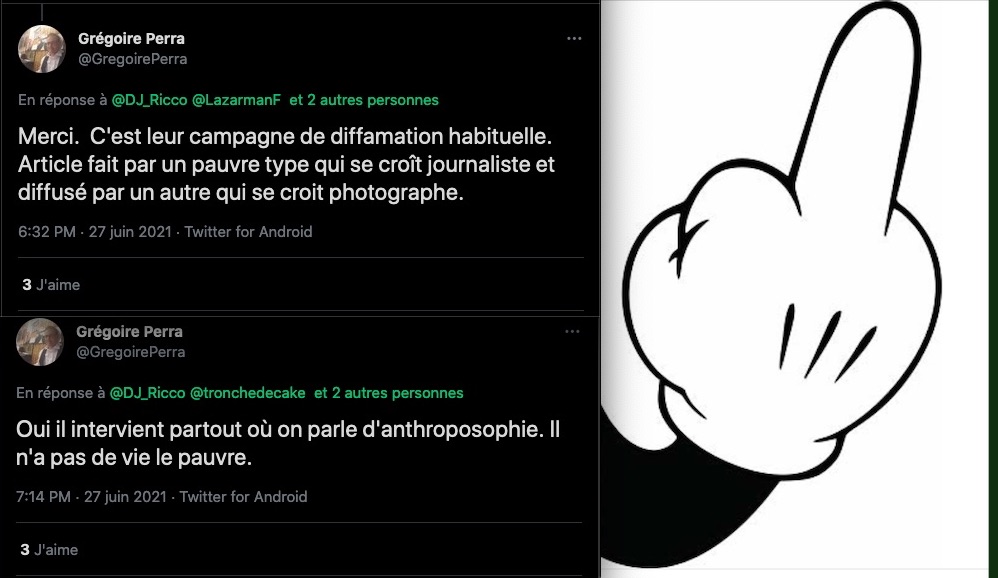 GP DIT QUE C’EST LE GOETHEANUM QUI AURAIT FABRIQUÉ LES ARTICLES DU MONDE ! Ce qui est très comique, c’est qu’à chaque fois Perra commet la faute de plus : là il dit carrément que c’est le Goetheanum qui a choisi les thèmes à traiter. Or, au Monde, ils savent très bien comment ils ont travaillé. LES ZETS RACONTENT QUE COMME ILS ONT TROUVÉ UN DOSSIER DE PRESSE, IL Y AURAIT UN LAPIN ! C’est hallucinant quand même qu’ils pensent avoir trouvé un truc en découvrant un dossier de presse, c’est vraiment ridicule !!! C’est vraiment des débiles. Et lui du coup, il se grille à chaque fois un peu plus dans ses délires. Croire Perra devient assez minable (de plus en plus). Mais ça Tweet, faut bien que cette communauté sous contrat travaille son vent et son putaclic !!!