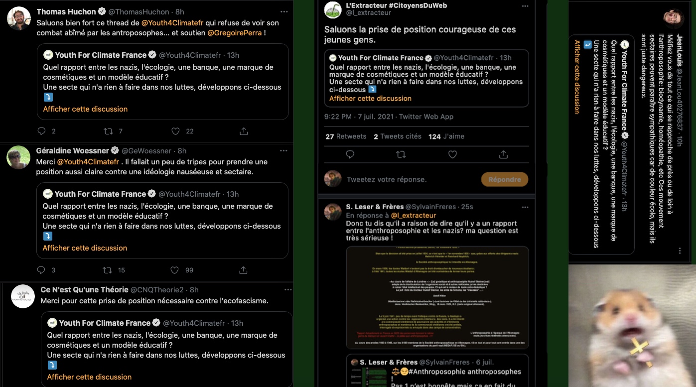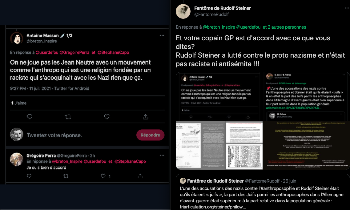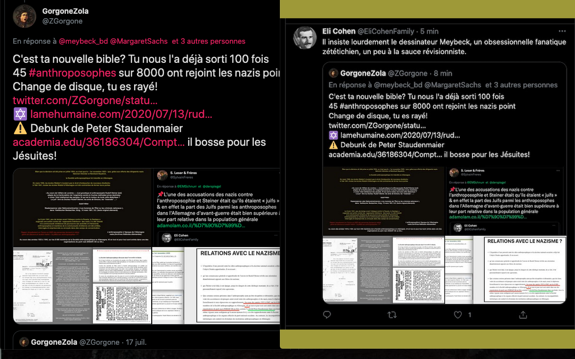 Une autre de leurs tâches, depuis le début, est de tenter de salir, d’ostraciser, de stigmatiser et de transformer numériquement le passé, le présent et le futur de l’anthroposophie sur le web. Avec une armée de zététiciens en appui, des geeks acharnés à la tâche dont la mission est la désinformation massive. Ce sont toujours plus ou moins les mêmes attaques avec quelques variantes : on sent bien l’acharnement et la pugnacité à tenter d’être le plus sournois possible en inversant la réalité et en la bidouillant. En ce moment, on voit les sempiternelles allégations de racisme et d’antisémitisme (de plus en plus ridicules et qui montrent que c’est sans doute d’eux-mêmes qu’ils parlent avant tout) alors l’une des accusations des nazis contre l’anthroposophie et Rudolf Steiner était qu’ils étaient « juifs ». A savoir que la proportion des Juifs parmi les anthroposophes dans l’Allemagne d’avant-guerre était supérieure à la part relative des Juifs dans la population générale : https://twitter.com/HolmezZherlock/status/1383841443320455174?s=20…