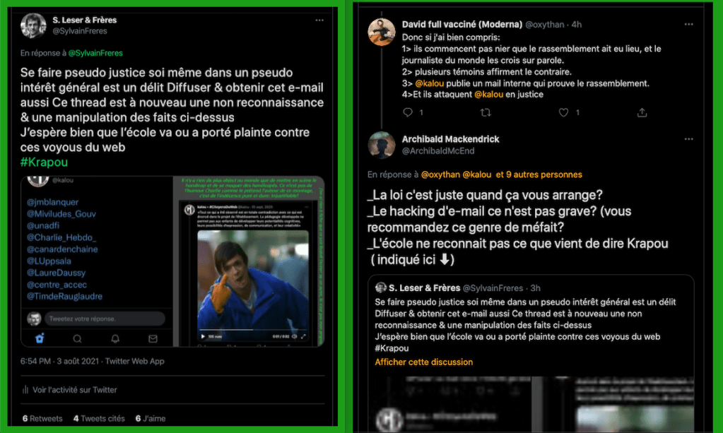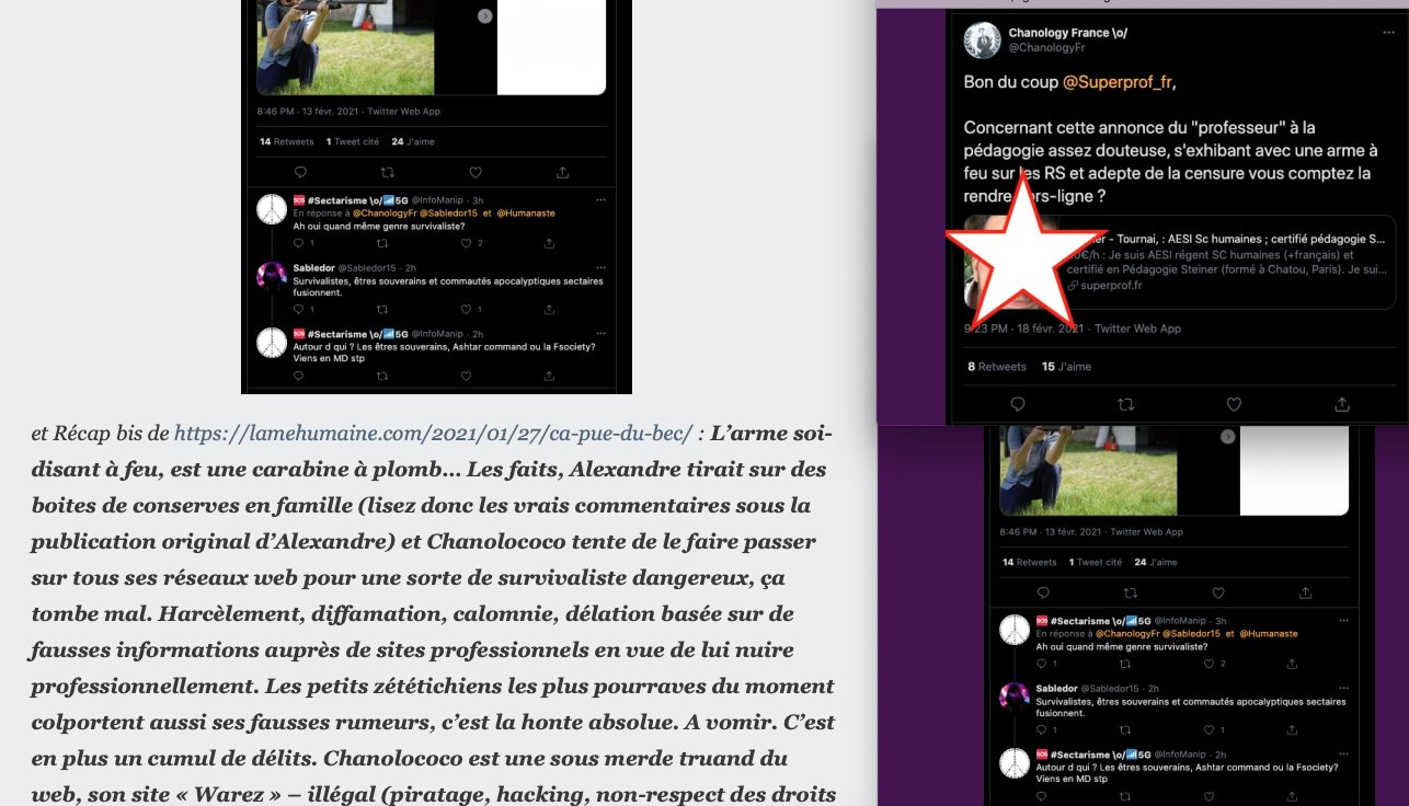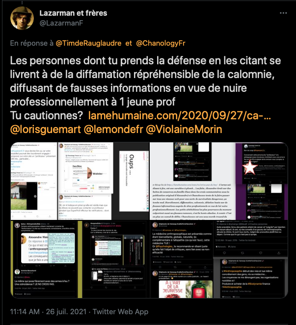 Les personnes dont tu prends la défense en les citant, se livrent à de la diffamation répréhensible, de la calomnie, diffusant de fausses informations en vue de nuire professionnellement à un jeune prof. Tu cautionnes? https://twitter.com/LazarmanF/status/1419586904123715585?s=20 & https://lamehumaine.com/2020/09/27/ca-pue-du-bec/ & https://lamehumaine.com/2020/09/27/les-sectes-2-0/ IMPORTANT
