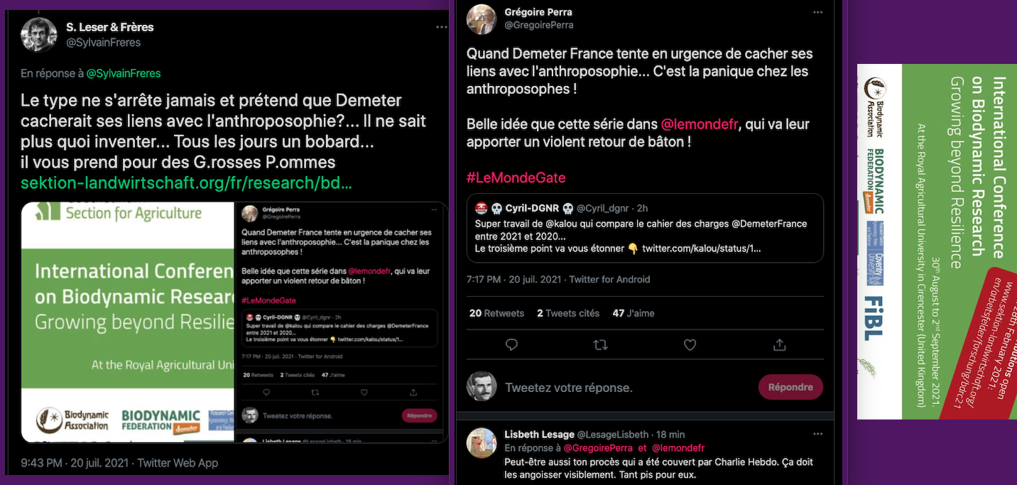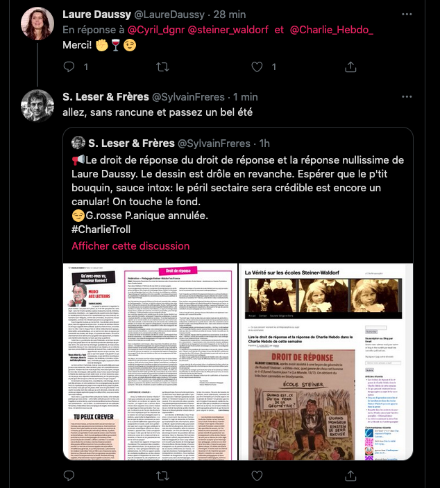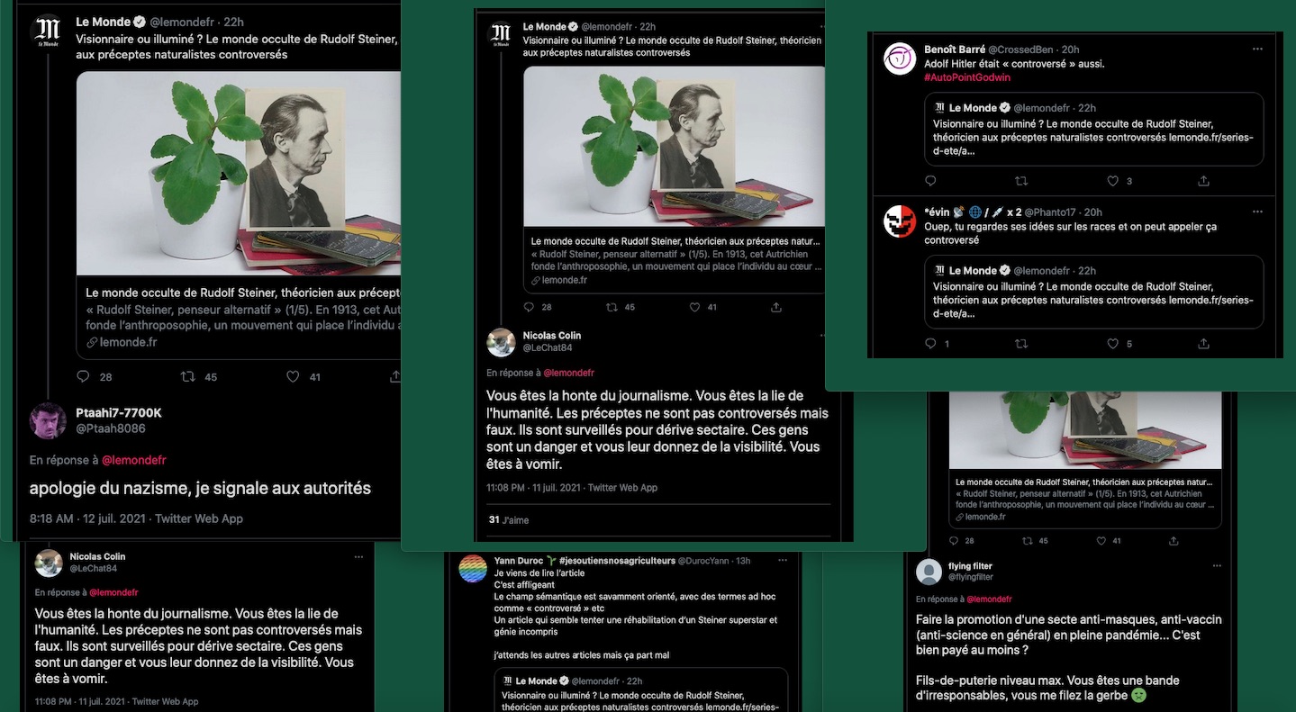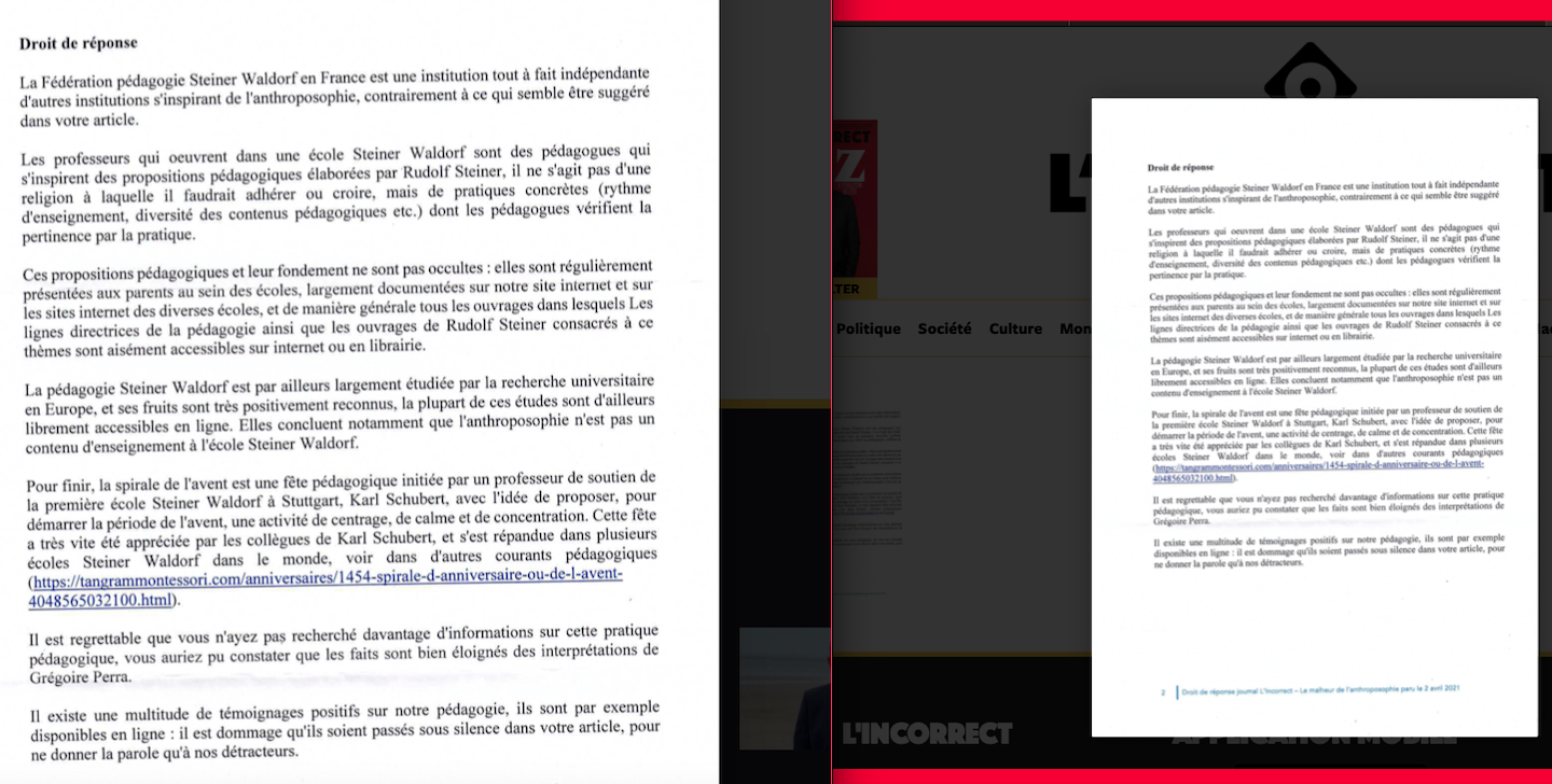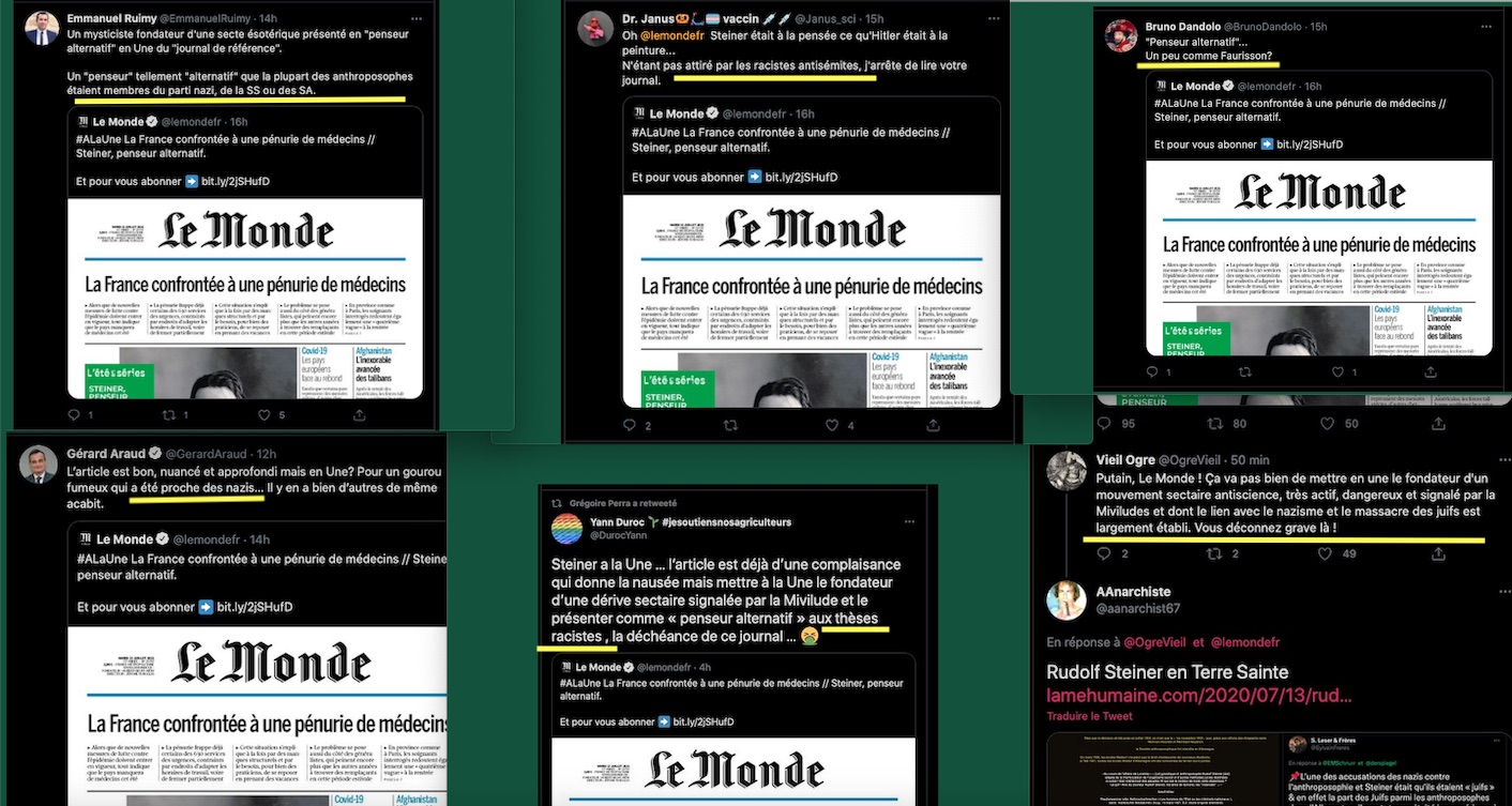 Une autre réponse : « Voici le texte que j’ai rédigé et transmis aux médecins français pour réponse officielle: Je suis surpris de noter dans l’article « Avec la pandémie, des phénomènes sectaires en pleine expansion » du 30 juillet 2021, le journaliste Emilien Urbach accuse à tort la médecine anthroposophique de dérive sectaire.