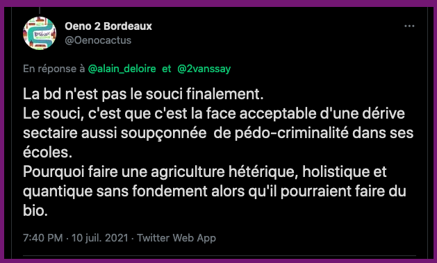 Les biodynamistes bénéficient eux du fruit des travaux de Rudolf Steiner qui proposait les bases d’une agriculture biologique alternative pour aider des paysans du monde entier à cultiver et soigner les terres suite aux nombreuses frasques des industriels et de leurs engrais chimiques synthétiques pestilentiels. En France cette approche pointilleuse du respect de la nature, des hommes, des bêtes marche à « plein pot ». Elle donne un résultat qui est, parait-il, “magique” sur les alcools. Hé oui, on autorise l’âme à un vin plus que l’âme d’un homme dans certains milieux pseudo rationalistes. C’est pourquoi je fais beaucoup de retapes sur le domaine où la vigne est impliquée dans les « Échauffourées » sur Twitter. Le paradoxe étant que, personnellement, je ne bois pas d’alcool et que je sois idéologiquement pour la réhabilitation de la loi Evin plus que celle en pratique qui est la loi du vin. Mais la biodynamie est loin d’être le simple commerce florissant du pinard :ce sont des fermes plus écologiques qui réparent les sols ; les bêtes semblent y être plus heureuses ; la nourriture est fabuleuse. Les chevaux dans les vignes et les moutons qui désherbent, c’est plutôt génial. Les jus de fruits et légumes Demeter ?! Vous pouvez m’en envoyer une caisse…😏Si ça peut aider le climat… https://twitter.com/ArchibaldMcEnd/status/1398280075385229313?s=20…