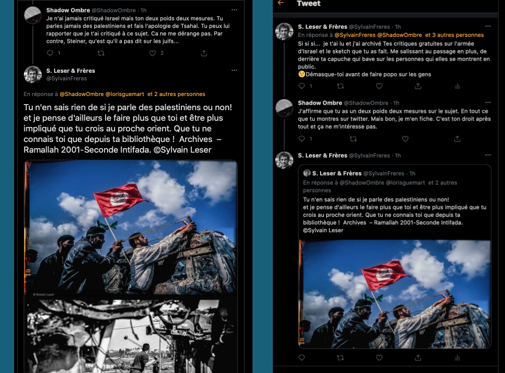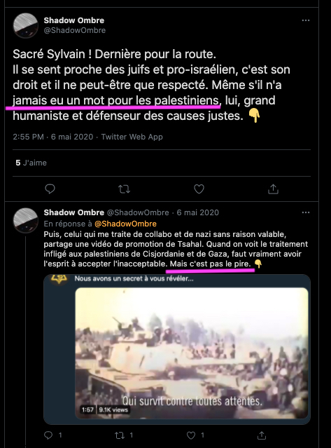 ✡️Les sionistes t’emmerdent, les juifs t’emmerdent, Israël t’emmerde, les laïques t’emmerdent et comme je suis l’ensemble de ces personnes, donc je t’emmerde à pied, à cheval et à dos de chameau! https://twitter.com/sylvangui/status/1258432367179546625?s=20 (il a effacé son tweet, que j’ai archivé)…