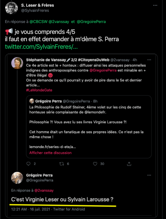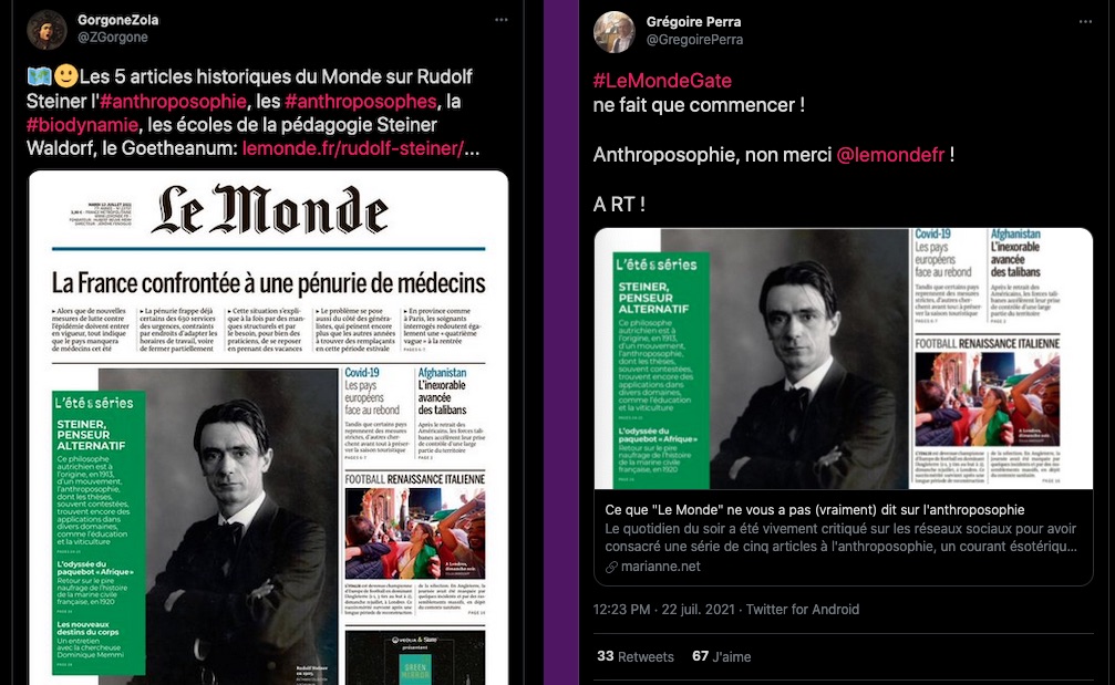 Marianne se moque du Monde !?! (je ne l’ai pas encore lu) GP jubile avec son #LeMondeGate _Premier fake concernant la Miviludes 0=0: https://twitter.com/aanarchist67/status/1404009562622107651 – Adenor le copain de Rauglaudre est-il crédible? Les 5 articles: https://www.lemonde.fr/rudolf-steiner/ –
