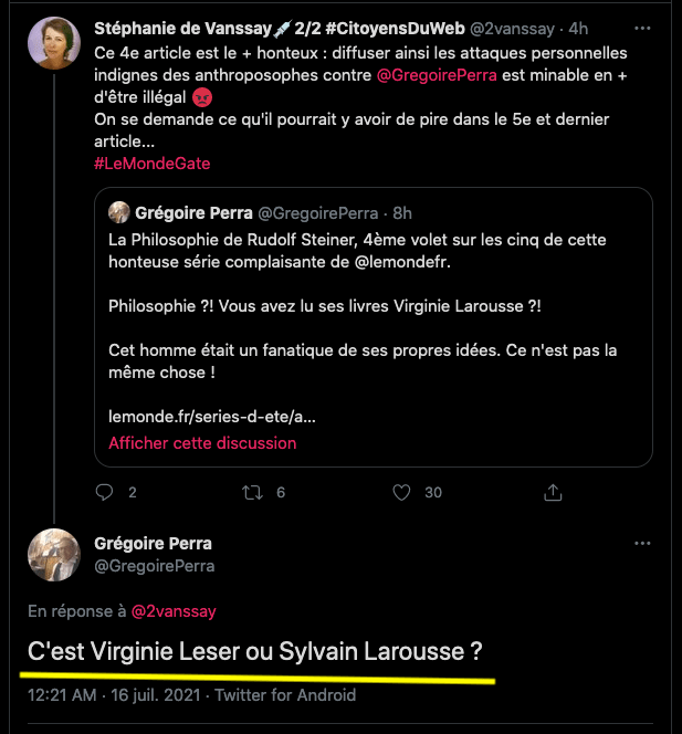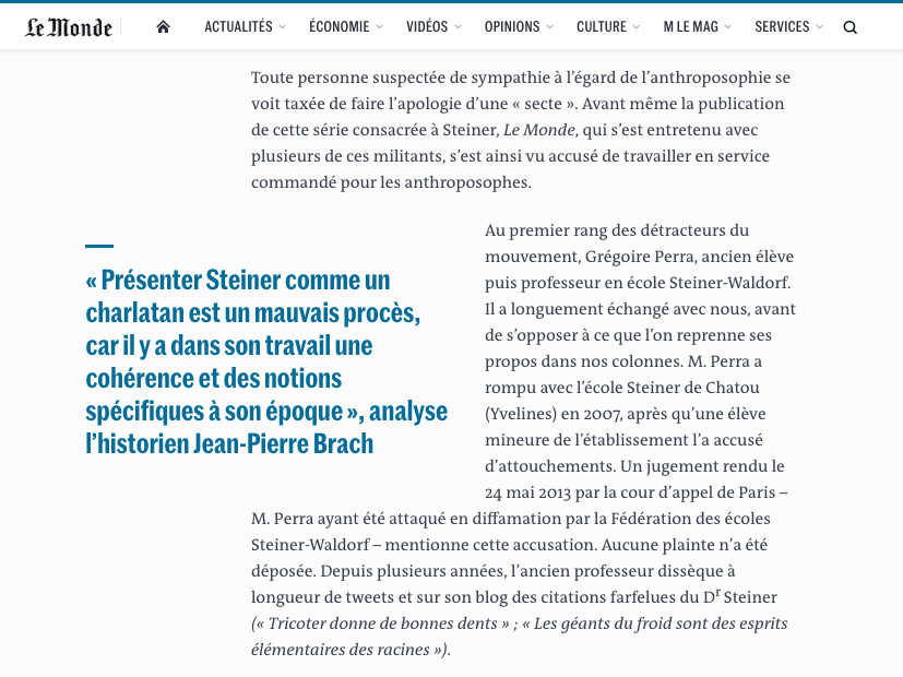 Les insultes à l’encontre du journal Le Monde de la part de GP sont nombreuses… il ne sait pas abdiquer devant sa propre démence à l’égard de l’anthroposophie…